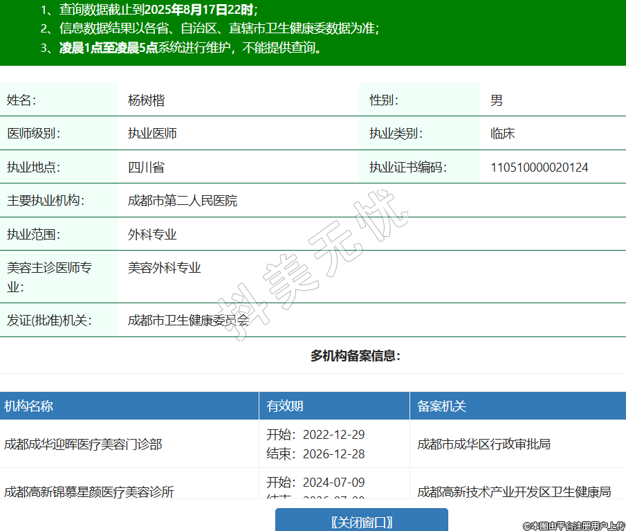 姓名:楊樹楷性別:男醫(yī)師級(jí)別:執(zhí)業(yè)醫(yī)師執(zhí)業(yè)類別:臨床執(zhí)業(yè)地點(diǎn):四川省執(zhí)業(yè)證書編碼:110510000020124主要執(zhí)業(yè)機(jī)構(gòu):成都市第二人民醫(yī)院執(zhí)業(yè)范圍:外科專業(yè)美容主診醫(yī)師專業(yè):美容外科專業(yè)發(fā)證(批準(zhǔn))機(jī)關(guān):成都市衛(wèi)生健康委員會(huì)多機(jī)構(gòu)備案信息:機(jī)構(gòu)名稱 有效期 備案機(jī)關(guān) 成都成華迎暉醫(yī)療美容門診部 開始:2022-12-29結(jié)束:2026-12-28成都市成華區(qū)行政審批局 成都高新錦慕星顏醫(yī)療美容診所 開始:2024-07-09結(jié)束:2026-07-08成都高新技術(shù)產(chǎn)業(yè)開發(fā)區(qū)衛(wèi)生健康局 成都金牛蕊森醫(yī)療美容門診部 開始:2024-10-21結(jié)束:2025-10-22成都市金牛區(qū)政務(wù)服務(wù)管理和行政審批局 安岳縣婦幼保健計(jì)劃生育服務(wù)中心 開始:2024-12-14結(jié)束:2025-12-20資陽(yáng)市衛(wèi)生健康委員會(huì) 成都武侯菁致達(dá)醫(yī)療美容門診部 開始:2025-03-06結(jié)束:2026-03-05成都市武侯區(qū)行政審批局 成都錦江微美悅己醫(yī)療美容門診部 開始:2025-05-24結(jié)束:2026-05-24成都市錦江區(qū)行政審批局 -
