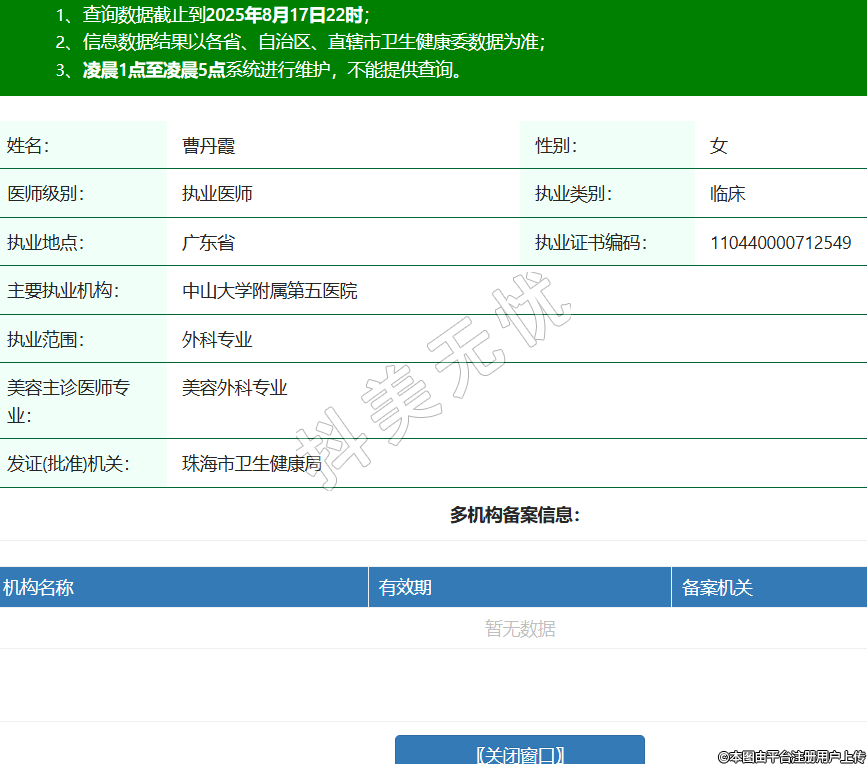 姓名:曹丹霞性別:女醫(yī)師級(jí)別:執(zhí)業(yè)醫(yī)師執(zhí)業(yè)類別:臨床執(zhí)業(yè)地點(diǎn):廣東省執(zhí)業(yè)證書編碼:110440000712549主要執(zhí)業(yè)機(jī)構(gòu):中山大學(xué)附屬第五醫(yī)院執(zhí)業(yè)范圍:外科專業(yè)美容主診醫(yī)師專業(yè):美容外科專業(yè)發(fā)證(批準(zhǔn))機(jī)關(guān):珠海市衛(wèi)生健康局 -