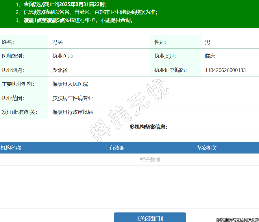 姓名:馮民性別:男醫(yī)師級別:執(zhí)業(yè)醫(yī)師執(zhí)業(yè)類別:臨床執(zhí)業(yè)地點(diǎn):湖北省執(zhí)業(yè)證書編碼:110420626000133主要執(zhí)業(yè)機(jī)構(gòu):??悼h人民醫(yī)院執(zhí)業(yè)范圍:皮膚病與性病專業(yè)發(fā)證(批準(zhǔn))機(jī)關(guān):??悼h行政審批局 -