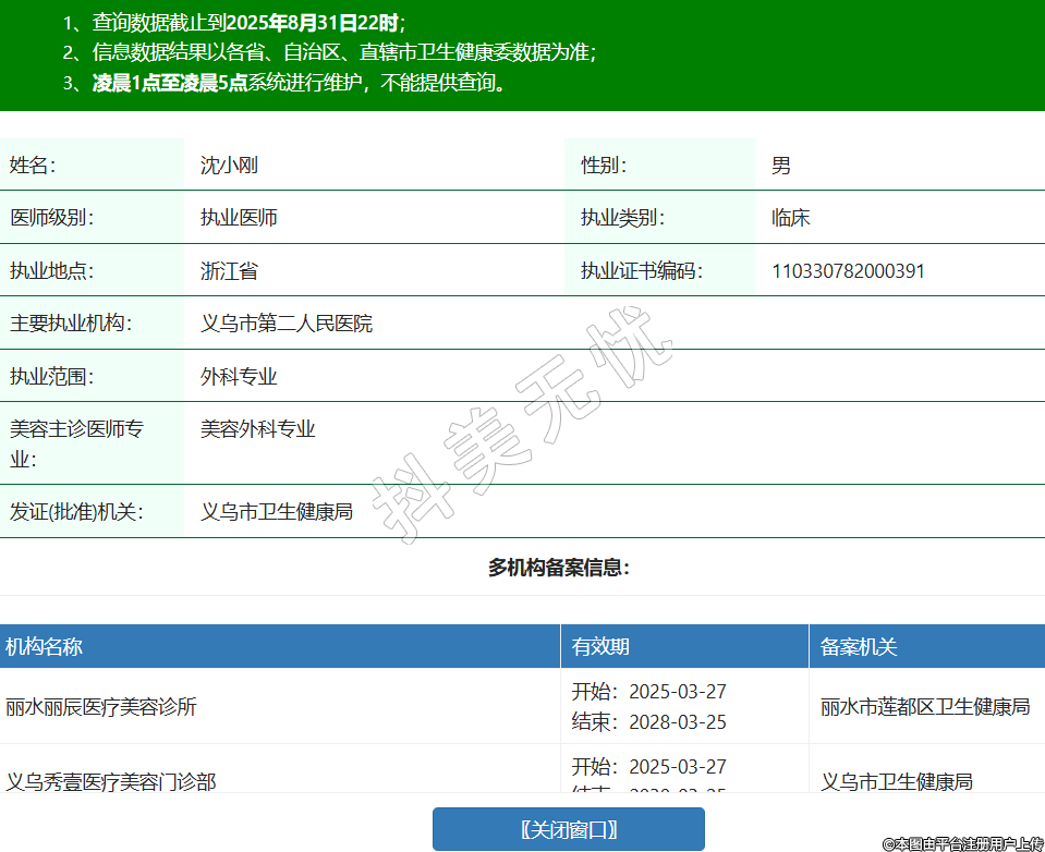 姓名:沈小剛性別:男醫(yī)師級(jí)別:執(zhí)業(yè)醫(yī)師執(zhí)業(yè)類別:臨床執(zhí)業(yè)地點(diǎn):浙江省執(zhí)業(yè)證書編碼:110330782000391主要執(zhí)業(yè)機(jī)構(gòu):義烏市第二人民醫(yī)院執(zhí)業(yè)范圍:外科專業(yè)美容主診醫(yī)師專業(yè):美容外科專業(yè)發(fā)證(批準(zhǔn))機(jī)關(guān):義烏市衛(wèi)生健康局多機(jī)構(gòu)備案信息:機(jī)構(gòu)名稱 有效期 備案機(jī)關(guān) 麗水麗辰醫(yī)療美容診所 開(kāi)始:2025-03-27結(jié)束:2028-03-25麗水市蓮都區(qū)衛(wèi)生健康局 義烏秀壹醫(yī)療美容門診部 開(kāi)始:2025-03-27結(jié)束:2030-03-25義烏市衛(wèi)生健康局 義烏百姿醫(yī)療美容門診部 開(kāi)始:2025-06-11結(jié)束:2028-06-09義烏市衛(wèi)生健康局 義烏媞雅醫(yī)療美容有限公司稠城診所 開(kāi)始:2025-06-26結(jié)束:2026-06-25義烏市衛(wèi)生健康局 義烏和煦醫(yī)療管理有限公司稠城醫(yī)療美容診所 開(kāi)始:2025-08-04結(jié)束:2026-08-03義烏市衛(wèi)生健康局 -