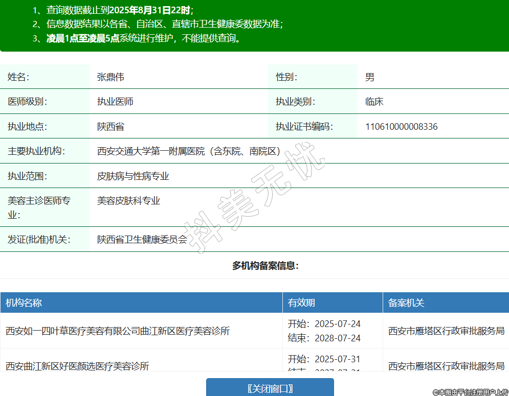 姓名:張鼎偉性別:男醫(yī)師級別:執(zhí)業(yè)醫(yī)師執(zhí)業(yè)類別:臨床執(zhí)業(yè)地點:陜西省執(zhí)業(yè)證書編碼:110610000008336主要執(zhí)業(yè)機構:西安交通大學第一附屬醫(yī)院(含東院、南院區(qū))執(zhí)業(yè)范圍:皮膚病與性病專業(yè)美容主診醫(yī)師專業(yè):美容皮膚科專業(yè)發(fā)證(批準)機關:陜西省衛(wèi)生健康委員會多機構備案信息:機構名稱 有效期 備案機關 西安如一四葉草醫(yī)療美容有限公司曲江新區(qū)醫(yī)療美容診所 開始:2025-07-24結束:2028-07-24西安市雁塔區(qū)行政審批服務局 西安曲江新區(qū)好醫(yī)顏選醫(yī)療美容診所 開始:2025-07-31結束:2027-07-31西安市雁塔區(qū)行政審批服務局 -