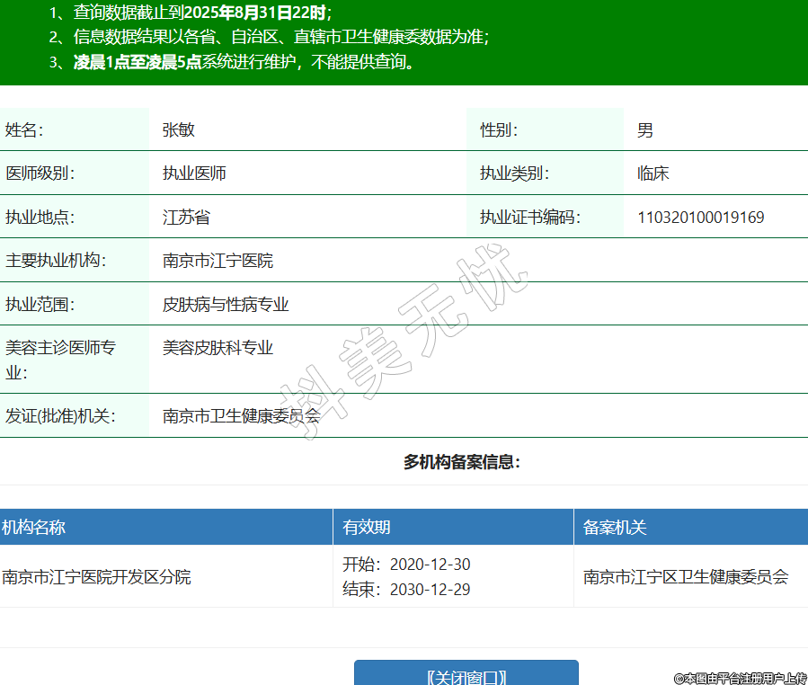 姓名:張敏性別:男醫(yī)師級別:執(zhí)業(yè)醫(yī)師執(zhí)業(yè)類別:臨床執(zhí)業(yè)地點:江蘇省執(zhí)業(yè)證書編碼:110320100019169主要執(zhí)業(yè)機構(gòu):南京市江寧醫(yī)院執(zhí)業(yè)范圍:皮膚病與性病專業(yè)美容主診醫(yī)師專業(yè):美容皮膚科專業(yè)發(fā)證(批準)機關(guān):南京市衛(wèi)生健康委員會多機構(gòu)備案信息:機構(gòu)名稱 有效期 備案機關(guān) 南京市江寧醫(yī)院開發(fā)區(qū)分院 開始:2020-12-30結(jié)束:2030-12-29南京市江寧區(qū)衛(wèi)生健康委員會 -