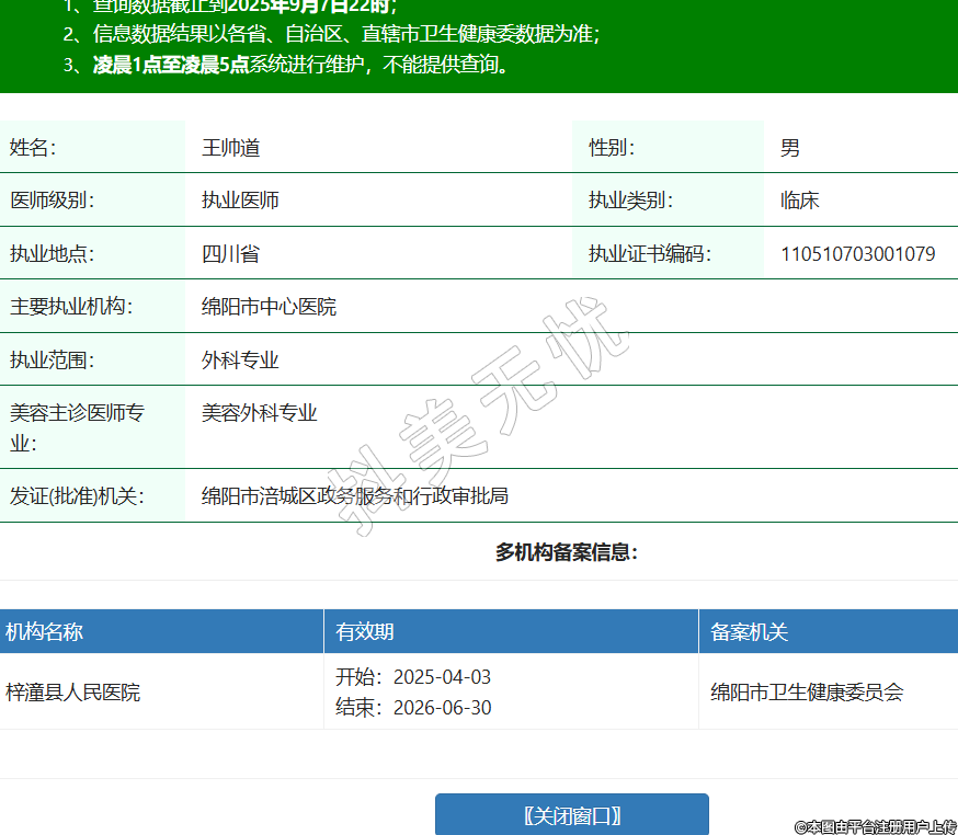 姓名:王帥道性別:男醫(yī)師級(jí)別:執(zhí)業(yè)醫(yī)師執(zhí)業(yè)類別:臨床執(zhí)業(yè)地點(diǎn):四川省執(zhí)業(yè)證書編碼:110510703001079主要執(zhí)業(yè)機(jī)構(gòu):綿陽(yáng)市中心醫(yī)院執(zhí)業(yè)范圍:外科專業(yè)美容主診醫(yī)師專業(yè):美容外科專業(yè)發(fā)證(批準(zhǔn))機(jī)關(guān):綿陽(yáng)市涪城區(qū)政務(wù)服務(wù)和行政審批局多機(jī)構(gòu)備案信息: