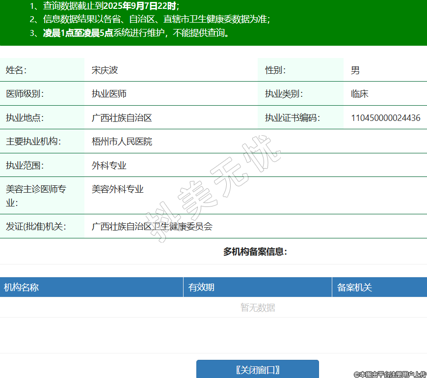 姓名:宋慶波性別:男醫(yī)師級(jí)別:執(zhí)業(yè)醫(yī)師執(zhí)業(yè)類別:臨床執(zhí)業(yè)地點(diǎn):廣西壯族自治區(qū)執(zhí)業(yè)證書編碼:110450000024436主要執(zhí)業(yè)機(jī)構(gòu):梧州市人民醫(yī)院執(zhí)業(yè)范圍:外科專業(yè)美容主診醫(yī)師專業(yè):美容外科專業(yè)發(fā)證(批準(zhǔn))機(jī)關(guān):廣西壯族自治區(qū)衛(wèi)生健康委員會(huì) -