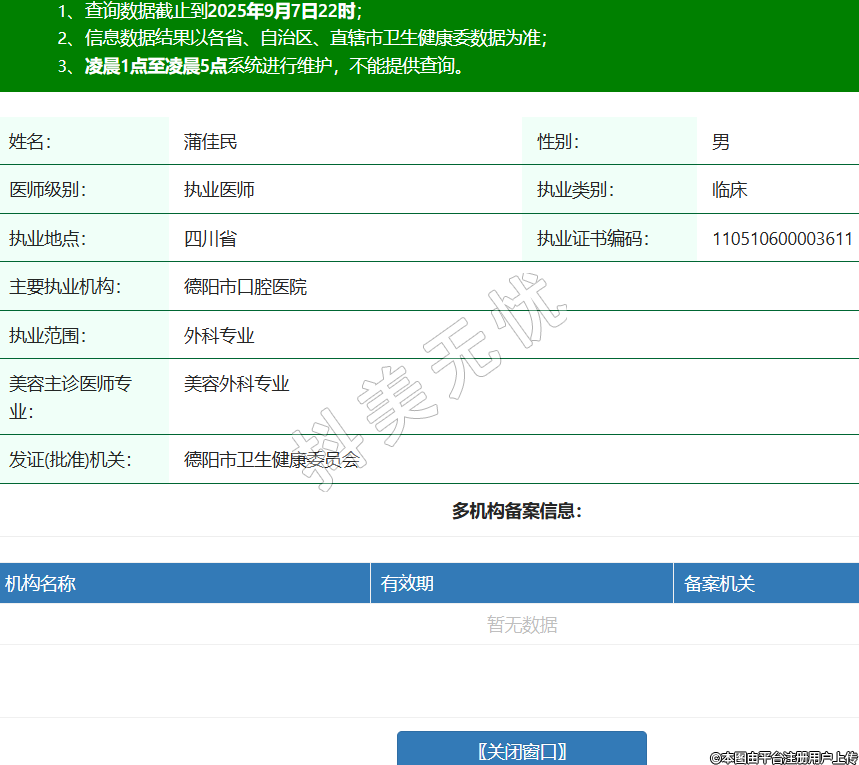 姓名:蒲佳民性別:男醫(yī)師級別:執(zhí)業(yè)醫(yī)師執(zhí)業(yè)類別:臨床執(zhí)業(yè)地點:四川省執(zhí)業(yè)證書編碼:110510600003611主要執(zhí)業(yè)機構(gòu):德陽市口腔醫(yī)院執(zhí)業(yè)范圍:外科專業(yè)美容主診醫(yī)師專業(yè):美容外科專業(yè)發(fā)證(批準(zhǔn))機關(guān):德陽市衛(wèi)生健康委員會 -