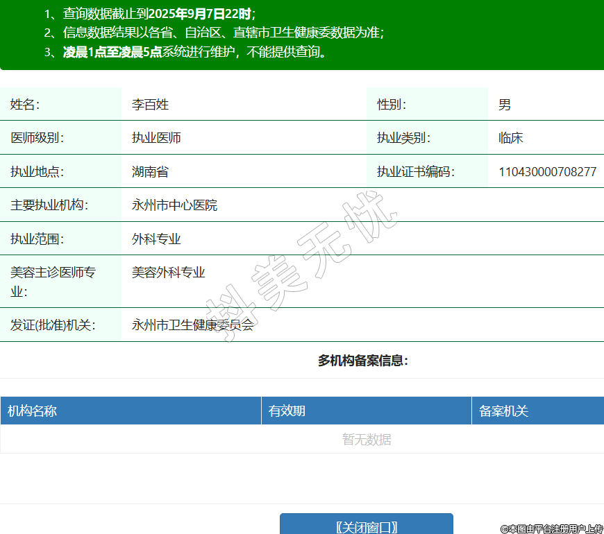 姓名:李百姓性別:男醫(yī)師級(jí)別:執(zhí)業(yè)醫(yī)師執(zhí)業(yè)類別:臨床執(zhí)業(yè)地點(diǎn):湖南省執(zhí)業(yè)證書編碼:110430000708277主要執(zhí)業(yè)機(jī)構(gòu):永州市中心醫(yī)院執(zhí)業(yè)范圍:外科專業(yè)美容主診醫(yī)師專業(yè):美容外科專業(yè)發(fā)證(批準(zhǔn))機(jī)關(guān):永州市衛(wèi)生健康委員會(huì) -