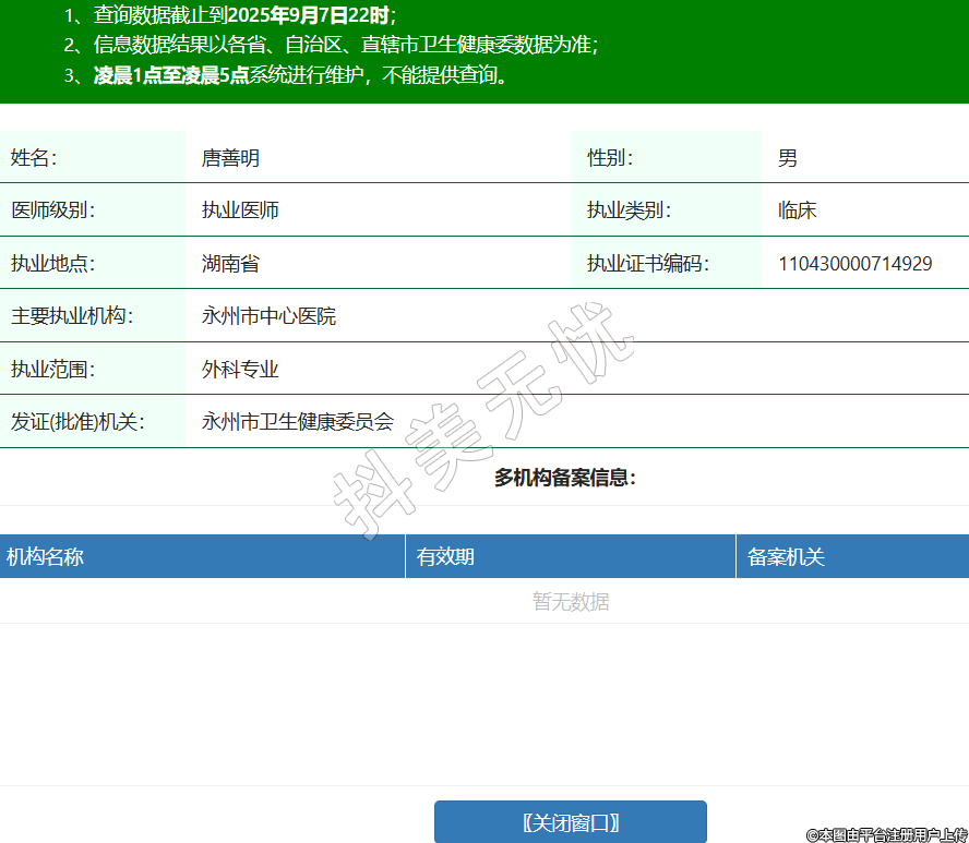 姓名:唐善明性別:男醫(yī)師級(jí)別:執(zhí)業(yè)醫(yī)師執(zhí)業(yè)類別:臨床執(zhí)業(yè)地點(diǎn):湖南省執(zhí)業(yè)證書編碼:110430000714929主要執(zhí)業(yè)機(jī)構(gòu):永州市中心醫(yī)院執(zhí)業(yè)范圍:外科專業(yè)發(fā)證(批準(zhǔn))機(jī)關(guān):永州市衛(wèi)生健康委員會(huì) -