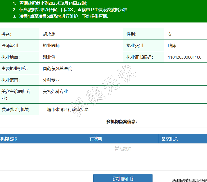 姓名:胡永璐性別:女醫(yī)師級(jí)別:執(zhí)業(yè)醫(yī)師執(zhí)業(yè)類別:臨床執(zhí)業(yè)地點(diǎn):湖北省執(zhí)業(yè)證書編碼:110420300001100主要執(zhí)業(yè)機(jī)構(gòu):國藥東風(fēng)總醫(yī)院執(zhí)業(yè)范圍:外科專業(yè)美容主診醫(yī)師專業(yè):美容外科專業(yè)發(fā)證(批準(zhǔn))機(jī)關(guān):十堰市張灣區(qū)行政審批局 -