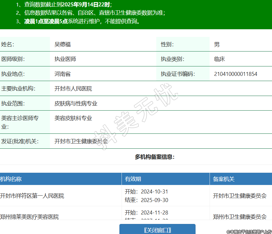 姓名:吳德福性別:男醫(yī)師級(jí)別:執(zhí)業(yè)醫(yī)師執(zhí)業(yè)類別:臨床執(zhí)業(yè)地點(diǎn):河南省執(zhí)業(yè)證書編碼:210410000011854主要執(zhí)業(yè)機(jī)構(gòu):開封市人民醫(yī)院執(zhí)業(yè)范圍:皮膚病與性病專業(yè)美容主診醫(yī)師專業(yè):美容皮膚科專業(yè)發(fā)證(批準(zhǔn))機(jī)關(guān):開封市衛(wèi)生健康委員會(huì)多機(jī)構(gòu)備案信息: