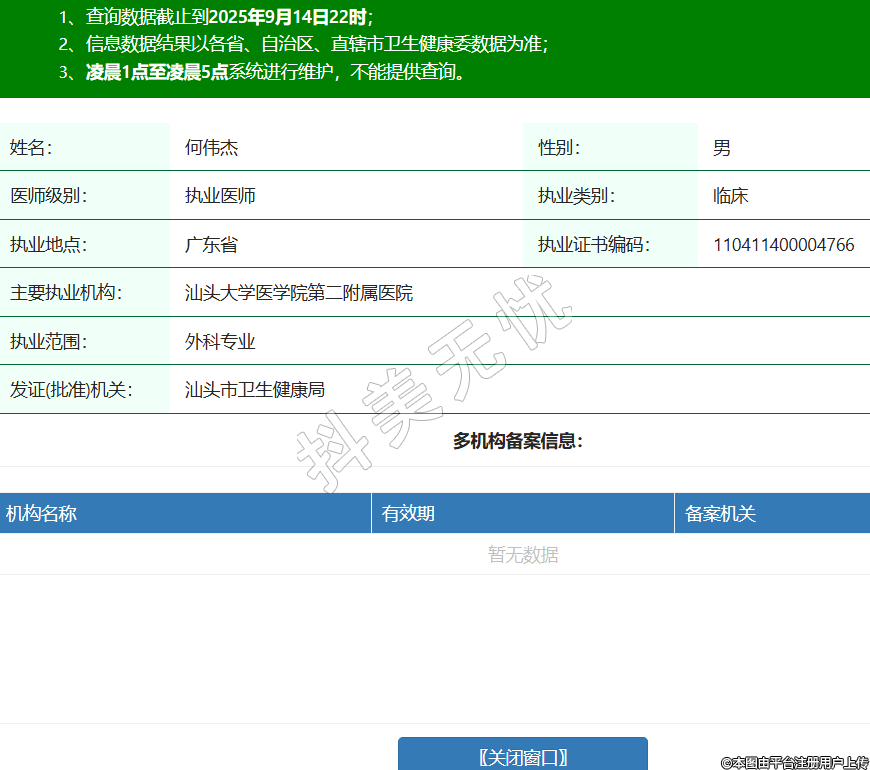 姓名:何偉杰性別:男醫(yī)師級(jí)別:執(zhí)業(yè)醫(yī)師執(zhí)業(yè)類別:臨床執(zhí)業(yè)地點(diǎn):廣東省執(zhí)業(yè)證書(shū)編碼:110411400004766主要執(zhí)業(yè)機(jī)構(gòu):汕頭大學(xué)醫(yī)學(xué)院第二附屬醫(yī)院執(zhí)業(yè)范圍:外科專業(yè)發(fā)證(批準(zhǔn))機(jī)關(guān):汕頭市衛(wèi)生健康局 -