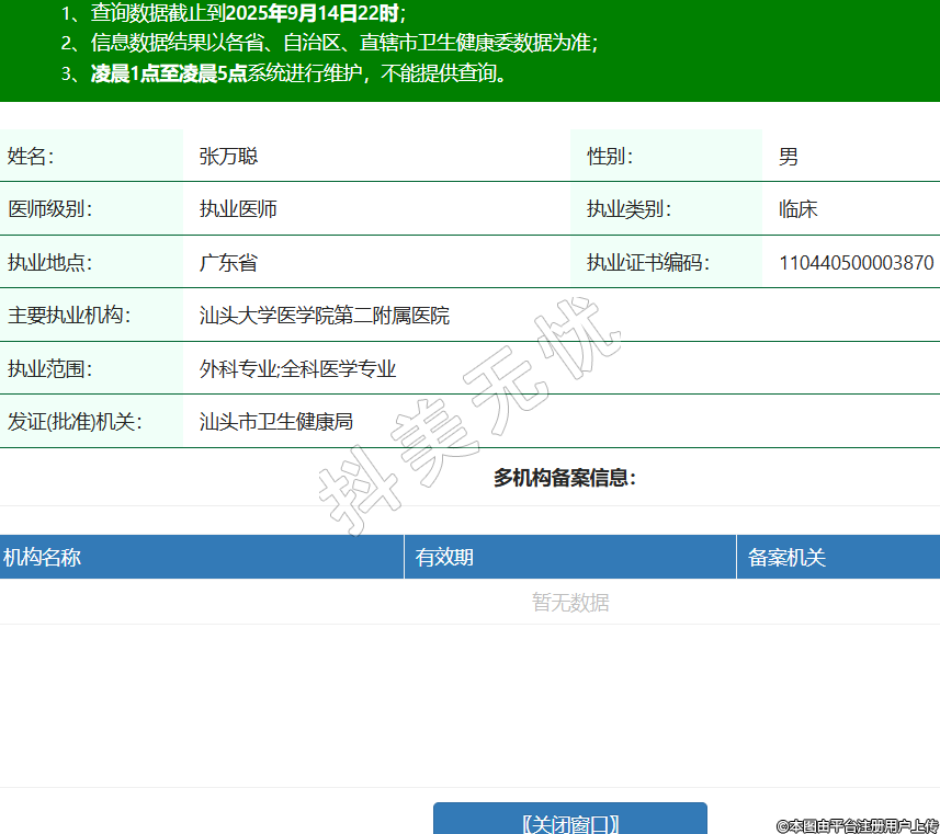 姓名:張萬聰性別:男醫(yī)師級別:執(zhí)業(yè)醫(yī)師執(zhí)業(yè)類別:臨床執(zhí)業(yè)地點:廣東省執(zhí)業(yè)證書編碼:110440500003870主要執(zhí)業(yè)機構(gòu):汕頭大學(xué)醫(yī)學(xué)院第二附屬醫(yī)院執(zhí)業(yè)范圍:外科專業(yè);全科醫(yī)學(xué)專業(yè)發(fā)證(批準(zhǔn))機關(guān):汕頭市衛(wèi)生健康局 -