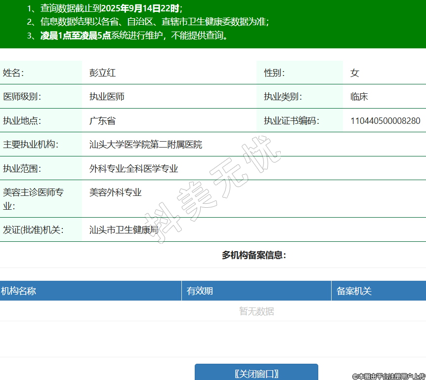 姓名:彭立紅性別:女醫(yī)師級(jí)別:執(zhí)業(yè)醫(yī)師執(zhí)業(yè)類別:臨床執(zhí)業(yè)地點(diǎn):廣東省執(zhí)業(yè)證書(shū)編碼:110440500008280主要執(zhí)業(yè)機(jī)構(gòu):汕頭大學(xué)醫(yī)學(xué)院第二附屬醫(yī)院執(zhí)業(yè)范圍:外科專業(yè);全科醫(yī)學(xué)專業(yè)美容主診醫(yī)師專業(yè):美容外科專業(yè)發(fā)證(批準(zhǔn))機(jī)關(guān):汕頭市衛(wèi)生健康局 -