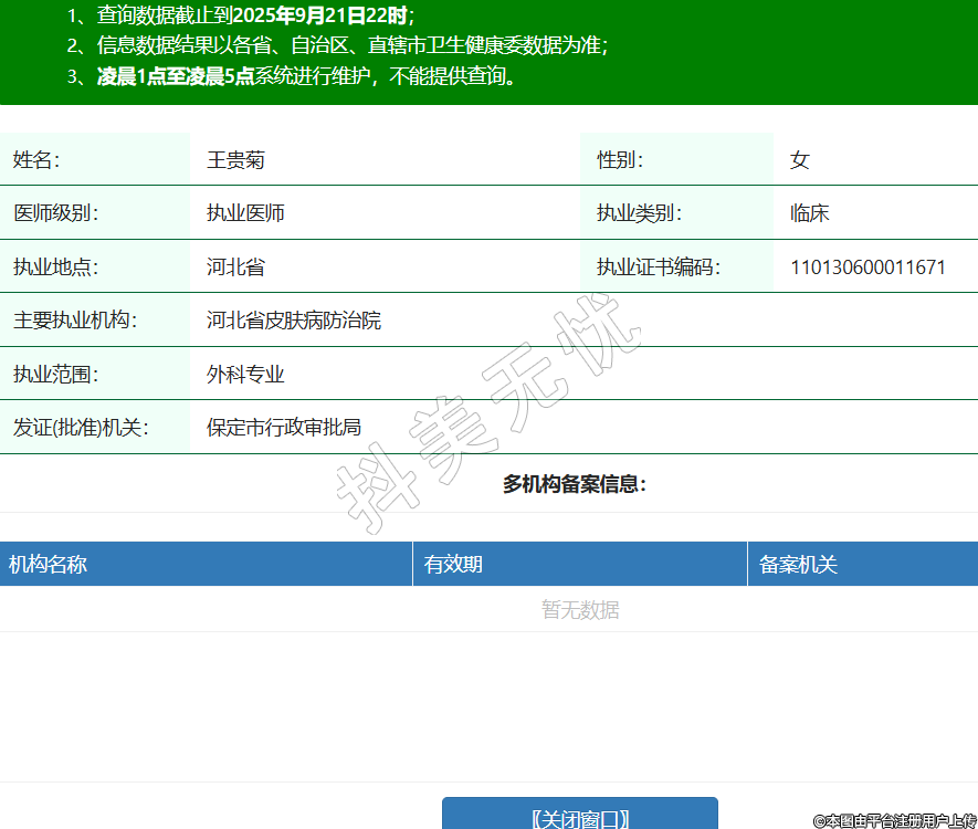 姓名:王貴菊性別:女醫(yī)師級(jí)別:執(zhí)業(yè)醫(yī)師執(zhí)業(yè)類別:臨床執(zhí)業(yè)地點(diǎn):河北省執(zhí)業(yè)證書編碼:110130600011671主要執(zhí)業(yè)機(jī)構(gòu):河北省皮膚病防治院執(zhí)業(yè)范圍:外科專業(yè)發(fā)證(批準(zhǔn))機(jī)關(guān):保定市行政審批局 -