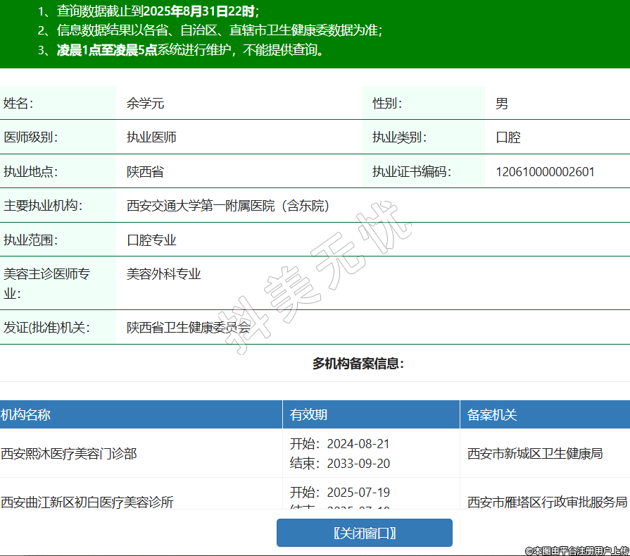 姓名:余學(xué)元性別:男醫(yī)師級(jí)別:執(zhí)業(yè)醫(yī)師執(zhí)業(yè)類(lèi)別:口腔執(zhí)業(yè)地點(diǎn):陜西省執(zhí)業(yè)證書(shū)編碼:120610000002601主要執(zhí)業(yè)機(jī)構(gòu):西安交通大學(xué)第一附屬醫(yī)院(含東院)執(zhí)業(yè)范圍:口腔專(zhuān)業(yè)美容主診醫(yī)師專(zhuān)業(yè):美容外科專(zhuān)業(yè)發(fā)證(批準(zhǔn))機(jī)關(guān):陜西省衛(wèi)生健康委員會(huì)多機(jī)構(gòu)備案信息:機(jī)構(gòu)名稱(chēng) 有效期 備案機(jī)關(guān) 西安熙沐醫(yī)療美容門(mén)診部 開(kāi)始:2024-08-21結(jié)束:2033-09-20西安市新城區(qū)衛(wèi)生健康局 西安曲江新區(qū)初白醫(yī)療美容診所 開(kāi)始:2025-07-19結(jié)束:2035-07-18西安市雁塔區(qū)行政審批服務(wù)局 -