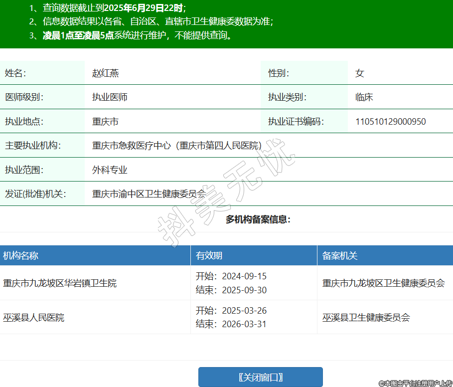 姓名:趙紅燕性別:女醫(yī)師級別:執(zhí)業(yè)醫(yī)師執(zhí)業(yè)類別:臨床執(zhí)業(yè)地點:重慶市執(zhí)業(yè)證書編碼:110510129000950主要執(zhí)業(yè)機構(gòu):重慶市急救醫(yī)療中心(重慶市第四人民醫(yī)院)執(zhí)業(yè)范圍:外科專業(yè)發(fā)證(批準)機關:重慶市渝中區(qū)衛(wèi)生健康委員會多機構(gòu)備案信息: