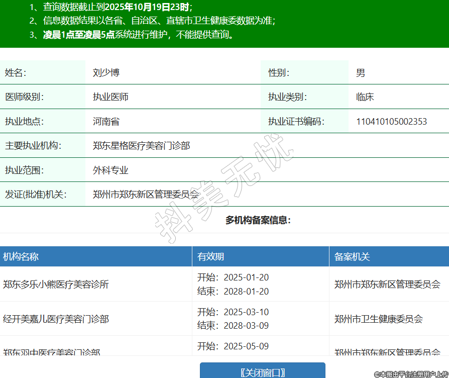 姓名:劉少博性別:男醫(yī)師級(jí)別:執(zhí)業(yè)醫(yī)師執(zhí)業(yè)類別:臨床執(zhí)業(yè)地點(diǎn):河南省執(zhí)業(yè)證書(shū)編碼:110410105002353主要執(zhí)業(yè)機(jī)構(gòu):鄭東星格醫(yī)療美容門診部執(zhí)業(yè)范圍:外科專業(yè)發(fā)證(批準(zhǔn))機(jī)關(guān):鄭州市鄭東新區(qū)管理委員會(huì)多機(jī)構(gòu)備案信息:機(jī)構(gòu)名稱 有效期 備案機(jī)關(guān) 鄭東多樂(lè)小熊醫(yī)療美容診所 開(kāi)始:2025-01-20結(jié)束:2028-01-20鄭州市鄭東新區(qū)管理委員會(huì) 經(jīng)開(kāi)美嘉兒醫(yī)療美容門診部 開(kāi)始:2025-03-10結(jié)束:2028-03-09鄭州市衛(wèi)生健康委員會(huì) 鄭東羽中醫(yī)療美容門診部 開(kāi)始:2025-05-09結(jié)束:2028-05-08鄭州市鄭東新區(qū)管理委員會(huì) -