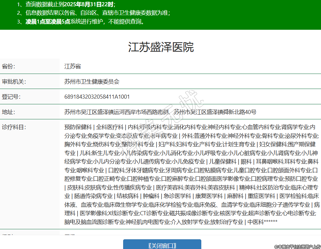 省份:江蘇省審批機關(guān):蘇州市衛(wèi)生健康委員會登記號:68918432032058411A1001地址:蘇州市吳江區(qū)盛澤鎮(zhèn)運河西岸市場西路南側(cè)、蘇州市吳江區(qū)盛澤鎮(zhèn)舜新北路40號診療科目:預(yù)防保健科 | 全科醫(yī)療科 | 內(nèi)科;呼吸內(nèi)科專業(yè);消化內(nèi)科專業(yè);神經(jīng)內(nèi)科專業(yè);心血管內(nèi)科專業(yè);腎病學(xué)專業(yè);內(nèi)分泌專業(yè);免疫學(xué)專業(yè);變態(tài)反應(yīng)專業(yè);老年病專業(yè) | 外科;普通外科專業(yè);神經(jīng)外科專業(yè);骨科專業(yè);泌尿外科專業(yè);胸外科專業(yè);燒傷科專業(yè);整形外科專業(yè) | 婦產(chǎn)科;婦科專業(yè);產(chǎn)科專業(yè);計劃生育專業(yè) | 婦女保健科;圍產(chǎn)期保健專業(yè) | 兒科;新生兒專業(yè);小兒傳染病專業(yè);小兒消化專業(yè);小兒呼吸專業(yè);小兒心臟病專業(yè);小兒腎病專業(yè);小兒神經(jīng)病學(xué)專業(yè);小兒內(nèi)分泌專業(yè);小兒遺傳病專業(yè);小兒免疫專業(yè) | 兒童保健科 | 眼科 | 耳鼻咽喉科;耳科專業(yè);鼻科專業(yè);咽喉科專業(yè) | 口腔科;牙體牙髓病專業(yè);牙周病專業(yè);口腔粘膜病專業(yè);兒童口腔專業(yè);口腔頜面外科專業(yè);口腔修復(fù)專業(yè);口腔正畸專業(yè);口腔種植專業(yè);口腔麻醉專業(yè);口腔頜面醫(yī)學(xué)影像專業(yè);口腔病理專業(yè);預(yù)防口腔專業(yè) | 皮膚科;皮膚病專業(yè);性傳播疾病專業(yè) | 醫(yī)療美容科;美容外科;美容皮膚科 | 精神科;社區(qū)防治專業(yè);臨床心理專業(yè) | 腸道傳染病專業(yè) | 結(jié)核病科 | 腫瘤科 | 急診醫(yī)學(xué)科 | 康復(fù)醫(yī)學(xué)科 | 麻醉科 | 重癥醫(yī)學(xué)科 | 醫(yī)學(xué)檢驗科;臨床體液、血液專業(yè);臨床微生物學(xué)專業(yè);臨床化學(xué)檢驗專業(yè);臨床免疫、血清學(xué)專業(yè);臨床細(xì)胞分子遺傳學(xué)專業(yè) | 病理科 | 醫(yī)學(xué)影像科;X線診斷專業(yè);CT診斷專業(yè);磁共振成像診斷專業(yè);核醫(yī)學(xué)專業(yè);超聲診斷專業(yè);心電診斷專業(yè);腦電及腦血流圖診斷專業(yè);神經(jīng)肌肉電圖專業(yè);介入放射學(xué)專業(yè);放射治療專業(yè) | 中醫(yī)科******級別:三級法定代表人:劉云主要負(fù)責(zé)人:齊栩執(zhí)業(yè)許可證有效期:2024/02/26 -至- 2034/12/07 -