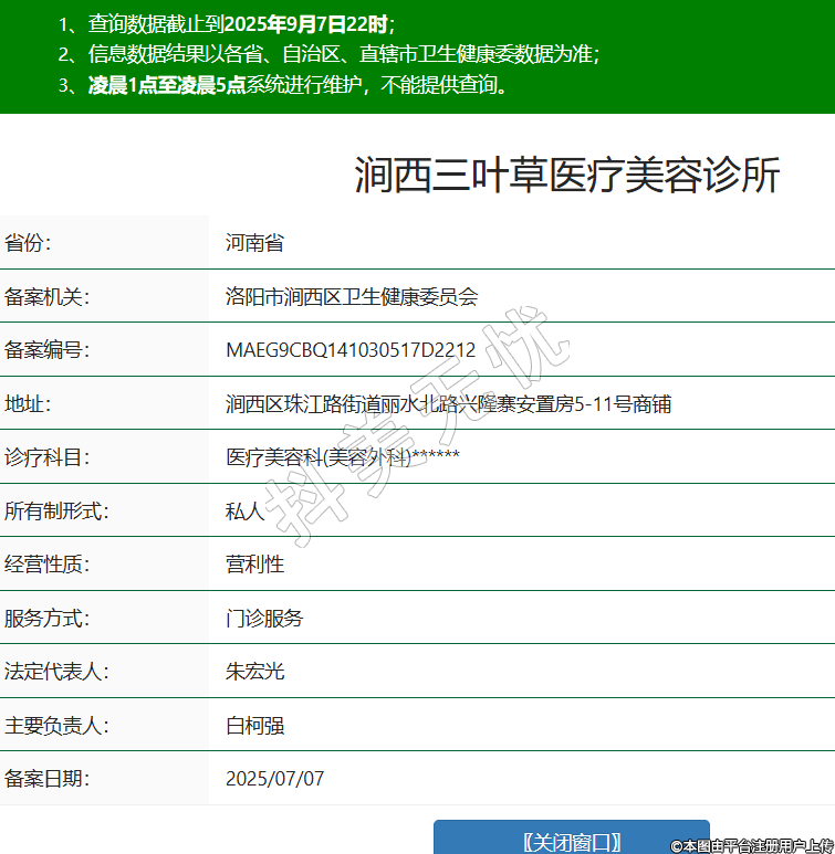 省份:河南省備案機(jī)關(guān):洛陽市澗西區(qū)衛(wèi)生健康委員會(huì)備案編號:MAEG9CBQ141030517D2212地址:澗西區(qū)珠江路街道麗水北路興隆寨安置房5-11號商鋪診療科目:醫(yī)療美容科(美容外科)******所有制形式:私人經(jīng)營性質(zhì):營利性服務(wù)方式:門診服務(wù)法定代表人:朱宏光主要負(fù)責(zé)人:白柯強(qiáng)備案日期:2025/07/07 -