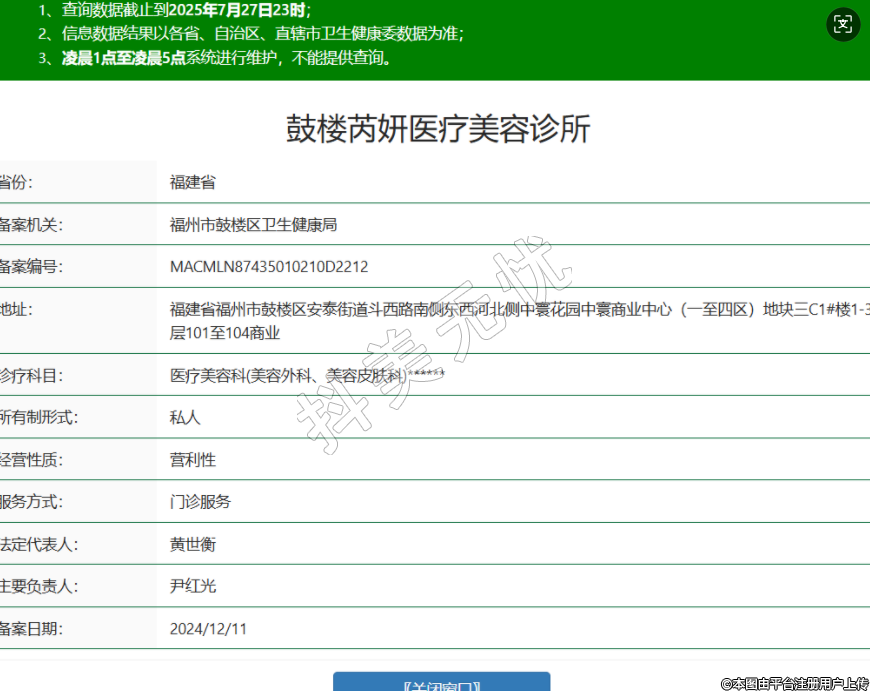 省份:福建省備案機(jī)關(guān):福州市鼓樓區(qū)衛(wèi)生健康局備案編號(hào):MACMLN87435010210D2212地址:福建省福州市鼓樓區(qū)安泰街道斗西路南側(cè)東西河北側(cè)中寰花園中寰商業(yè)中心(一至四區(qū))地塊三C1#樓1-3層101至104商業(yè)診療科目:醫(yī)療美容科(美容外科、美容皮膚科)******所有制形式:私人經(jīng)營(yíng)性質(zhì):營(yíng)利性服務(wù)方式:門診服務(wù)法定代表人:黃世衡主要負(fù)責(zé)人:尹紅光備案日期:2024/12/11 -