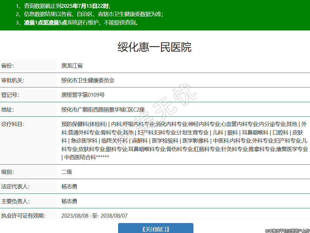 省份:黑龍江省審批機(jī)關(guān):綏化市衛(wèi)生健康委員會(huì)登記號(hào):黑綏營(yíng)字第0109號(hào)地址:綏化市廣順街西路麗景華城C區(qū)C2座診療科目:預(yù)防保健科(體檢科) | 內(nèi)科;呼吸內(nèi)科專(zhuān)業(yè);消化內(nèi)科專(zhuān)業(yè);神經(jīng)內(nèi)科專(zhuān)業(yè);心血管內(nèi)科專(zhuān)業(yè);內(nèi)分泌專(zhuān)業(yè);其他 | 外科;普通外科專(zhuān)業(yè);骨科專(zhuān)業(yè);其他 | 婦產(chǎn)科;婦科專(zhuān)業(yè);計(jì)劃生育專(zhuān)業(yè) | 兒科 | 眼科 | 耳鼻咽喉科 | 口腔科 | 皮膚科 | 急診醫(yī)學(xué)科 | 臨終關(guān)懷科 | 麻醉科 | 醫(yī)學(xué)檢驗(yàn)科 | 醫(yī)學(xué)影像科 | 中醫(yī)科;內(nèi)科專(zhuān)業(yè);外科專(zhuān)業(yè);婦產(chǎn)科專(zhuān)業(yè);兒科專(zhuān)業(yè);皮膚科專(zhuān)業(yè);眼科專(zhuān)業(yè);耳鼻咽喉科專(zhuān)業(yè);骨傷科專(zhuān)業(yè);肛腸科專(zhuān)業(yè);針灸科專(zhuān)業(yè);推拿科專(zhuān)業(yè);康復(fù)醫(yī)學(xué)專(zhuān)業(yè) | 中西醫(yī)結(jié)合科******級(jí)別:二級(jí)法定代表人:楊志勇主要負(fù)責(zé)人:楊志勇執(zhí)業(yè)許可證有效期:2023/08/08 -至- 2038/08/07 -