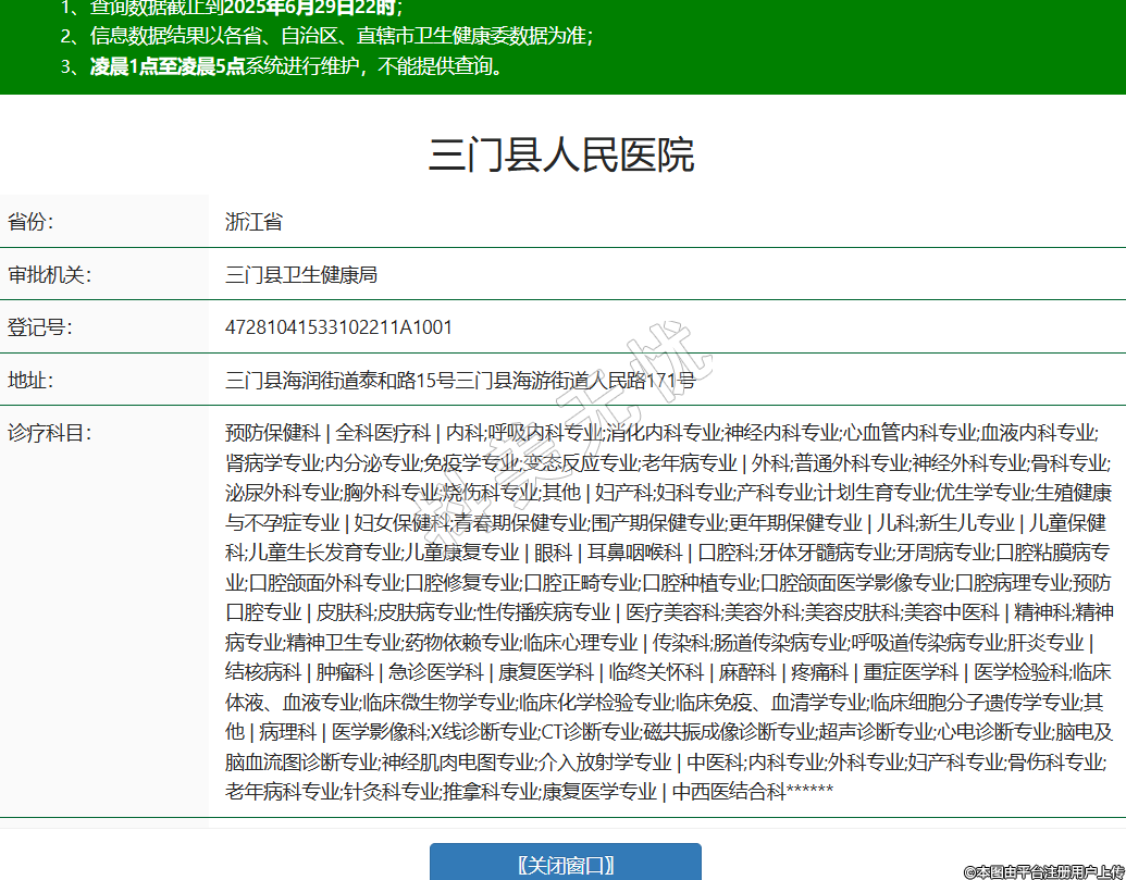 省份:浙江省審批機(jī)關(guān):三門(mén)縣衛(wèi)生健康局登記號(hào):47281041533102211A1001地址:三門(mén)縣海潤(rùn)街道泰和路15號(hào)三門(mén)縣海游街道人民路171號(hào)診療科目:預(yù)防保健科 | 全科醫(yī)療科 | 內(nèi)科;呼吸內(nèi)科專(zhuān)業(yè);消化內(nèi)科專(zhuān)業(yè);神經(jīng)內(nèi)科專(zhuān)業(yè);心血管內(nèi)科專(zhuān)業(yè);血液內(nèi)科專(zhuān)業(yè);腎病學(xué)專(zhuān)業(yè);內(nèi)分泌專(zhuān)業(yè);免疫學(xué)專(zhuān)業(yè);變態(tài)反應(yīng)專(zhuān)業(yè);老年病專(zhuān)業(yè) | 外科;普通外科專(zhuān)業(yè);神經(jīng)外科專(zhuān)業(yè);骨科專(zhuān)業(yè);泌尿外科專(zhuān)業(yè);胸外科專(zhuān)業(yè);燒傷科專(zhuān)業(yè);其他 | 婦產(chǎn)科;婦科專(zhuān)業(yè);產(chǎn)科專(zhuān)業(yè);計(jì)劃生育專(zhuān)業(yè);優(yōu)生學(xué)專(zhuān)業(yè);生殖健康與不孕癥專(zhuān)業(yè) | 婦女保健科;青春期保健專(zhuān)業(yè);圍產(chǎn)期保健專(zhuān)業(yè);更年期保健專(zhuān)業(yè) | 兒科;新生兒專(zhuān)業(yè) | 兒童保健科;兒童生長(zhǎng)發(fā)育專(zhuān)業(yè);兒童康復(fù)專(zhuān)業(yè) | 眼科 | 耳鼻咽喉科 | 口腔科;牙體牙髓病專(zhuān)業(yè);牙周病專(zhuān)業(yè);口腔粘膜病專(zhuān)業(yè);口腔頜面外科專(zhuān)業(yè);口腔修復(fù)專(zhuān)業(yè);口腔正畸專(zhuān)業(yè);口腔種植專(zhuān)業(yè);口腔頜面醫(yī)學(xué)影像專(zhuān)業(yè);口腔病理專(zhuān)業(yè);預(yù)防口腔專(zhuān)業(yè) | 皮膚科;皮膚病專(zhuān)業(yè);性傳播疾病專(zhuān)業(yè) | 醫(yī)療美容科;美容外科;美容皮膚科;美容中醫(yī)科 | 精神科;精神病專(zhuān)業(yè);精神衛(wèi)生專(zhuān)業(yè);藥物依賴(lài)專(zhuān)業(yè);臨床心理專(zhuān)業(yè) | 傳染科;腸道傳染病專(zhuān)業(yè);呼吸道傳染病專(zhuān)業(yè);肝炎專(zhuān)業(yè) | 結(jié)核病科 | 腫瘤科 | 急診醫(yī)學(xué)科 | 康復(fù)醫(yī)學(xué)科 | 臨終關(guān)懷科 | 麻醉科 | 疼痛科 | 重癥醫(yī)學(xué)科 | 醫(yī)學(xué)檢驗(yàn)科;臨床體液、血液專(zhuān)業(yè);臨床微生物學(xué)專(zhuān)業(yè);臨床化學(xué)檢驗(yàn)專(zhuān)業(yè);臨床免疫、血清學(xué)專(zhuān)業(yè);臨床細(xì)胞分子遺傳學(xué)專(zhuān)業(yè);其他 | 病理科 | 醫(yī)學(xué)影像科;X線(xiàn)診斷專(zhuān)業(yè);CT診斷專(zhuān)業(yè);磁共振成像診斷專(zhuān)業(yè);超聲診斷專(zhuān)業(yè);心電診斷專(zhuān)業(yè);腦電及腦血流圖診斷專(zhuān)業(yè);神經(jīng)肌肉電圖專(zhuān)業(yè);介入放射學(xué)專(zhuān)業(yè) | 中醫(yī)科;內(nèi)科專(zhuān)業(yè);外科專(zhuān)業(yè);婦產(chǎn)科專(zhuān)業(yè);骨傷科專(zhuān)業(yè);老年病科專(zhuān)業(yè);針灸科專(zhuān)業(yè);推拿科專(zhuān)業(yè);康復(fù)醫(yī)學(xué)專(zhuān)業(yè) | 中西醫(yī)結(jié)合科******級(jí)別:三級(jí)法定代表人:黎宏章主要負(fù)責(zé)人:黎宏章執(zhí)業(yè)許可證有效期:2015/11/10 -至- 2030/11/09 -