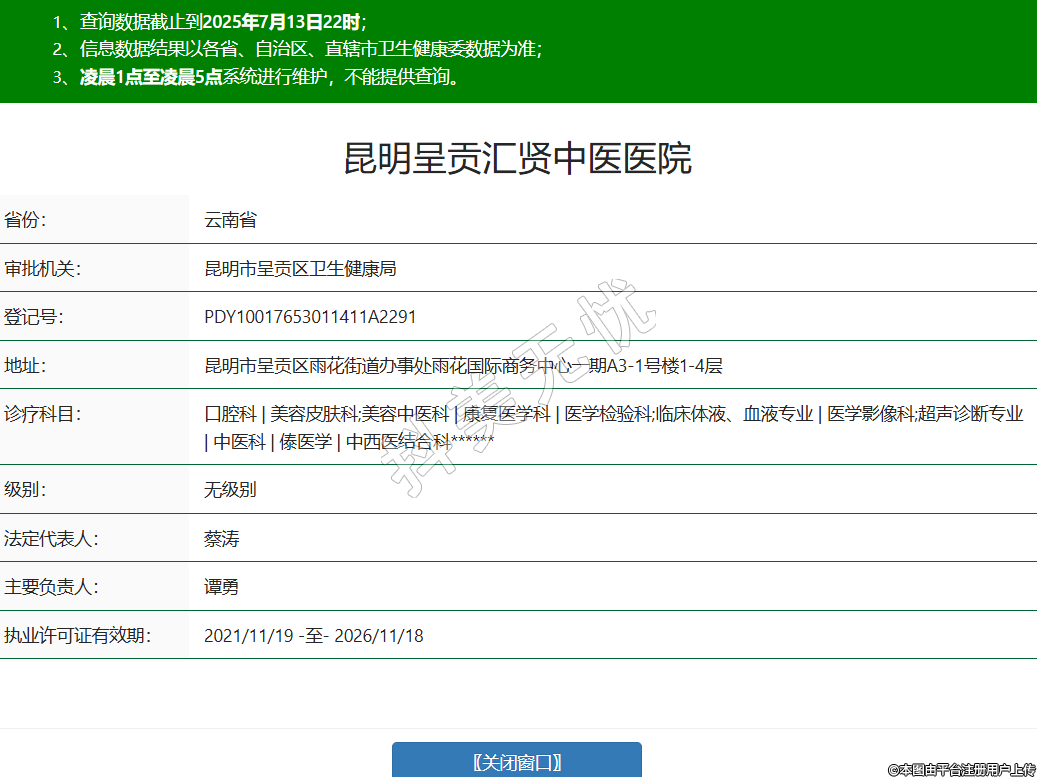 省份:云南省審批機關:昆明市呈貢區(qū)衛(wèi)生健康局登記號:PDY10017653011411A2291地址:昆明市呈貢區(qū)雨花街道辦事處雨花國際商務中心一期A3-1號樓1-4層診療科目:口腔科 | 美容皮膚科;美容中醫(yī)科 | 康復醫(yī)學科 | 醫(yī)學檢驗科;臨床體液、血液專業(yè) | 醫(yī)學影像科;超聲診斷專業(yè) | 中醫(yī)科 | 傣醫(yī)學 | 中西醫(yī)結(jié)合科******級別:無級別法定代表人:蔡濤主要負責人:譚勇執(zhí)業(yè)許可證有效期:2021/11/19 -至- 2026/11/18 -