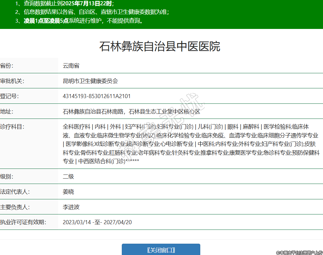 省份:云南省審批機關(guān):昆明市衛(wèi)生健康委員會登記號:43145193-853012611A2101地址:石林彝族自治縣石林南路,石林縣生態(tài)工業(yè)集中區(qū)核心區(qū)診療科目:全科醫(yī)療科 | 內(nèi)科 | 外科 | 婦產(chǎn)科(門診);婦科專業(yè)(門診) | 兒科(門診) | 眼科 | 麻醉科 | 醫(yī)學(xué)檢驗科;臨床體液、血液專業(yè);臨床微生物學(xué)專業(yè)(協(xié)議);臨床化學(xué)檢驗專業(yè);臨床免疫、血清學(xué)專業(yè);臨床細(xì)胞分子遺傳學(xué)專業(yè) | 醫(yī)學(xué)影像科;X線診斷專業(yè);超聲診斷專業(yè);心電診斷專業(yè) | 中醫(yī)科;內(nèi)科專業(yè);外科專業(yè);婦產(chǎn)科專業(yè)(門診);皮膚科專業(yè);骨傷科專業(yè);肛腸科專業(yè);老年病科專業(yè);針灸科專業(yè);推拿科專業(yè);康復(fù)醫(yī)學(xué)專業(yè);急診科專業(yè);預(yù)防保健科專業(yè) | 中西醫(yī)結(jié)合科(門診)******級別:二級法定代表人:姜曉主要負(fù)責(zé)人:李進(jìn)波執(zhí)業(yè)許可證有效期:2023/03/14 -至- 2027/04/20 -