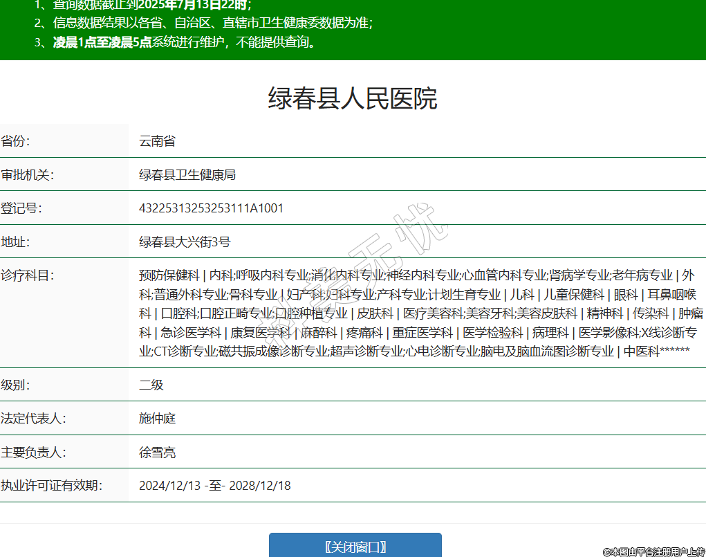 省份:云南省審批機(jī)關(guān):綠春縣衛(wèi)生健康局登記號:43225313253253111A1001地址:綠春縣大興街3號診療科目:預(yù)防保健科 | 內(nèi)科;呼吸內(nèi)科專業(yè);消化內(nèi)科專業(yè);神經(jīng)內(nèi)科專業(yè);心血管內(nèi)科專業(yè);腎病學(xué)專業(yè);老年病專業(yè) | 外科;普通外科專業(yè);骨科專業(yè) | 婦產(chǎn)科;婦科專業(yè);產(chǎn)科專業(yè);計(jì)劃生育專業(yè) | 兒科 | 兒童保健科 | 眼科 | 耳鼻咽喉科 | 口腔科;口腔正畸專業(yè);口腔種植專業(yè) | 皮膚科 | 醫(yī)療美容科;美容牙科;美容皮膚科 | 精神科 | 傳染科 | 腫瘤科 | 急診醫(yī)學(xué)科 | 康復(fù)醫(yī)學(xué)科 | 麻醉科 | 疼痛科 | 重癥醫(yī)學(xué)科 | 醫(yī)學(xué)檢驗(yàn)科 | 病理科 | 醫(yī)學(xué)影像科;X線診斷專業(yè);CT診斷專業(yè);磁共振成像診斷專業(yè);超聲診斷專業(yè);心電診斷專業(yè);腦電及腦血流圖診斷專業(yè) | 中醫(yī)科******級別:二級法定代表人:施仲庭主要負(fù)責(zé)人:徐雪亮執(zhí)業(yè)許可證有效期:2024/12/13 -至- 2028/12/18 -