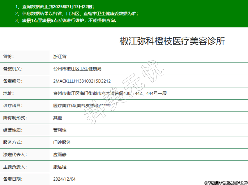 省份:浙江省備案機(jī)關(guān):臺(tái)州市椒江區(qū)衛(wèi)生健康局備案編號(hào):2MACKLLLH133100215D2212地址:臺(tái)州市椒江區(qū)海門街道市府大道東段438、442、444號(hào)一層診療科目:醫(yī)療美容科(美容皮膚科)******所有制形式:其他經(jīng)營(yíng)性質(zhì):營(yíng)利性服務(wù)方式:門診服務(wù)法定代表人:應(yīng)雨靜主要負(fù)責(zé)人:康遠(yuǎn)程備案日期:2024/12/04 -