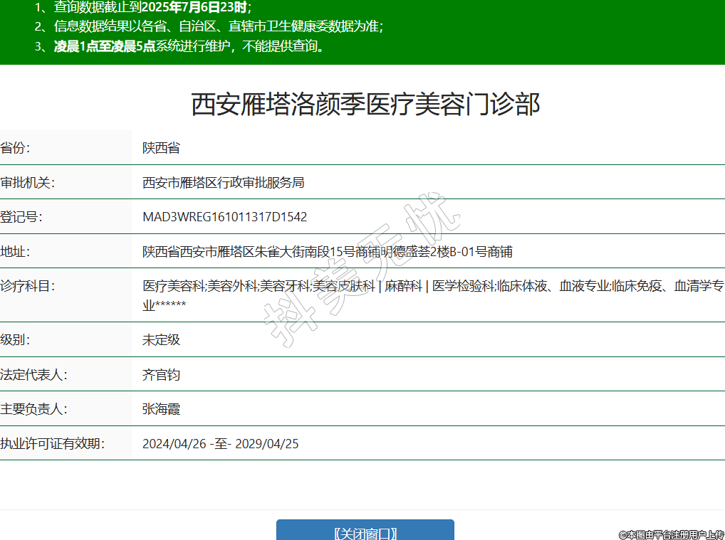 省份:陜西省審批機(jī)關(guān):西安市雁塔區(qū)行政審批服務(wù)局登記號:MAD3WREG161011317D1542地址:陜西省西安市雁塔區(qū)朱雀大街南段15號商鋪明德盛薈2樓B-01號商鋪診療科目:醫(yī)療美容科;美容外科;美容牙科;美容皮膚科 | 麻醉科 | 醫(yī)學(xué)檢驗(yàn)科;臨床體液、血液專業(yè);臨床免疫、血清學(xué)專業(yè)******級別:未定級法定代表人:齊官鈞主要負(fù)責(zé)人:張海霞執(zhí)業(yè)許可證有效期:2024/04/26 -至- 2029/04/25 -