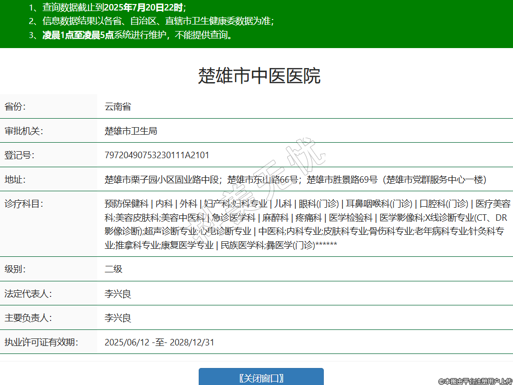 省份:云南省審批機(jī)關(guān):楚雄市衛(wèi)生局登記號(hào):79720490753230111A2101地址:楚雄市栗子園小區(qū)固業(yè)路中段;楚雄市東山路66號(hào);楚雄市勝景路69號(hào)(楚雄市黨群服務(wù)中心一樓)診療科目:預(yù)防保健科 | 內(nèi)科 | 外科 | 婦產(chǎn)科;婦科專業(yè) | 兒科 | 眼科(門診) | 耳鼻咽喉科(門診) | 口腔科(門診) | 醫(yī)療美容科;美容皮膚科;美容中醫(yī)科 | 急診醫(yī)學(xué)科 | 麻醉科 | 疼痛科 | 醫(yī)學(xué)檢驗(yàn)科 | 醫(yī)學(xué)影像科;X線診斷專業(yè)(CT、DR影像診斷);超聲診斷專業(yè);心電診斷專業(yè) | 中醫(yī)科;內(nèi)科專業(yè);皮膚科專業(yè);骨傷科專業(yè);老年病科專業(yè);針灸科專業(yè);推拿科專業(yè);康復(fù)醫(yī)學(xué)專業(yè) | 民族醫(yī)學(xué)科;彝醫(yī)學(xué)(門診)******級(jí)別:二級(jí)法定代表人:李興良主要負(fù)責(zé)人:李興良執(zhí)業(yè)許可證有效期:2025/06/12 -至- 2028/12/31 -
