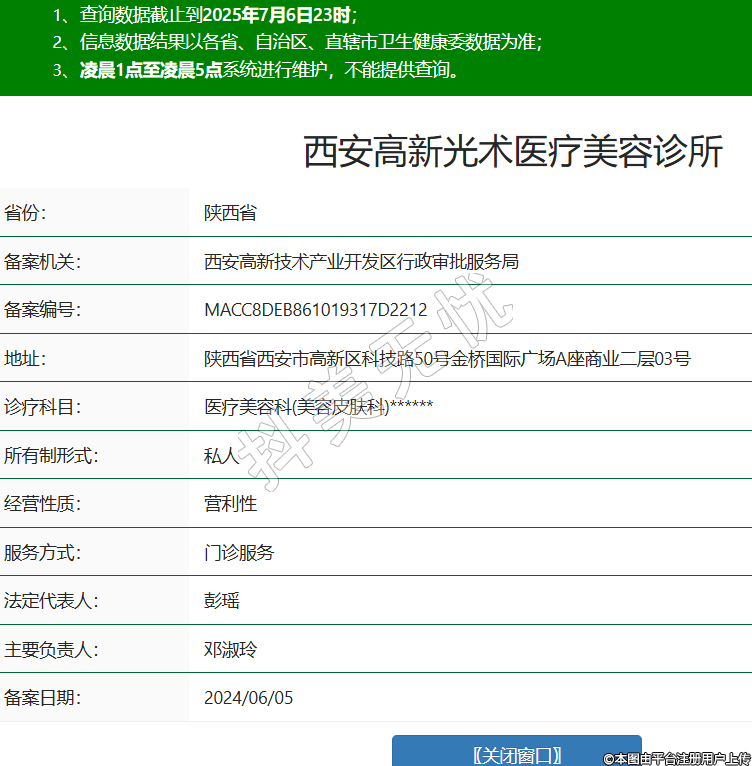 省份:陜西省備案機(jī)關(guān):西安高新技術(shù)產(chǎn)業(yè)開(kāi)發(fā)區(qū)行政審批服務(wù)局備案編號(hào):MACC8DEB861019317D2212地址:陜西省西安市高新區(qū)科技路50號(hào)金橋國(guó)際廣場(chǎng)A座商業(yè)二層03號(hào)診療科目:醫(yī)療美容科(美容皮膚科)******所有制形式:私人經(jīng)營(yíng)性質(zhì):營(yíng)利性服務(wù)方式:門(mén)診服務(wù)法定代表人:彭瑤主要負(fù)責(zé)人:鄧淑玲備案日期:2024/06/05 -