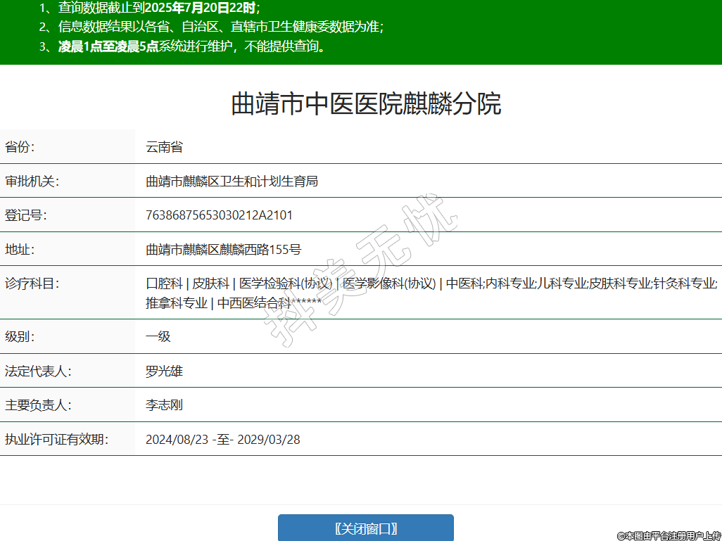 曲靖市中醫(yī)醫(yī)院麒麟分院,診療科目:口腔科 | 皮膚科 | 醫(yī)學(xué)檢驗科(協(xié)議) | 醫(yī)學(xué)影像科(協(xié)議) | 中醫(yī)科;內(nèi)科專業(yè);兒科專業(yè);皮膚科專業(yè);針灸科專業(yè);推拿科專業(yè) | 中西醫(yī)結(jié)合科******