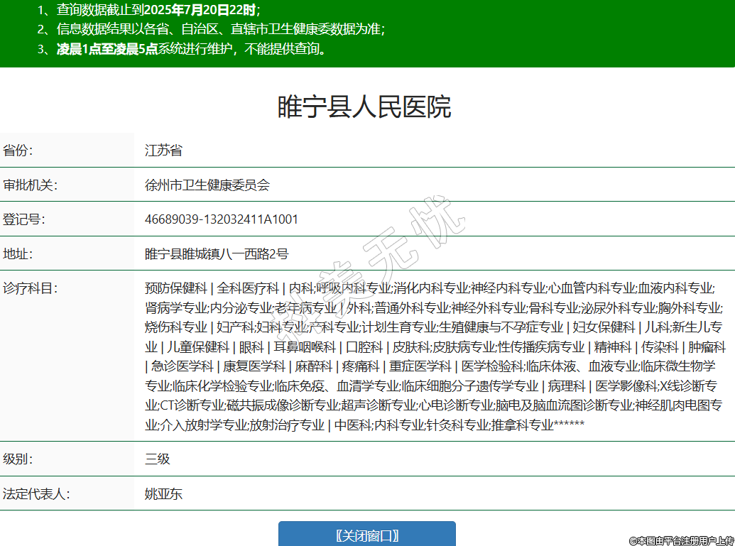 省份:江蘇省審批機(jī)關(guān):徐州市衛(wèi)生健康委員會(huì)登記號(hào):46689039-132032411A1001地址:睢寧縣睢城鎮(zhèn)八一西路2號(hào)診療科目:預(yù)防保健科 | 全科醫(yī)療科 | 內(nèi)科;呼吸內(nèi)科專業(yè);消化內(nèi)科專業(yè);神經(jīng)內(nèi)科專業(yè);心血管內(nèi)科專業(yè);血液內(nèi)科專業(yè);腎病學(xué)專業(yè);內(nèi)分泌專業(yè);老年病專業(yè) | 外科;普通外科專業(yè);神經(jīng)外科專業(yè);骨科專業(yè);泌尿外科專業(yè);胸外科專業(yè);燒傷科專業(yè) | 婦產(chǎn)科;婦科專業(yè);產(chǎn)科專業(yè);計(jì)劃生育專業(yè);生殖健康與不孕癥專業(yè) | 婦女保健科 | 兒科;新生兒專業(yè) | 兒童保健科 | 眼科 | 耳鼻咽喉科 | 口腔科 | 皮膚科;皮膚病專業(yè);性傳播疾病專業(yè) | 精神科 | 傳染科 | 腫瘤科 | 急診醫(yī)學(xué)科 | 康復(fù)醫(yī)學(xué)科 | 麻醉科 | 疼痛科 | 重癥醫(yī)學(xué)科 | 醫(yī)學(xué)檢驗(yàn)科;臨床體液、血液專業(yè);臨床微生物學(xué)專業(yè);臨床化學(xué)檢驗(yàn)專業(yè);臨床免疫、血清學(xué)專業(yè);臨床細(xì)胞分子遺傳學(xué)專業(yè) | 病理科 | 醫(yī)學(xué)影像科;X線診斷專業(yè);CT診斷專業(yè);磁共振成像診斷專業(yè);超聲診斷專業(yè);心電診斷專業(yè);腦電及腦血流圖診斷專業(yè);神經(jīng)肌肉電圖專業(yè);介入放射學(xué)專業(yè);放射治療專業(yè) | 中醫(yī)科;內(nèi)科專業(yè);針灸科專業(yè);推拿科專業(yè)******級(jí)別:三級(jí)法定代表人:姚亞東主要負(fù)責(zé)人:姚亞東執(zhí)業(yè)許可證有效期:2019/12/16 -至- 2034/12/15 -