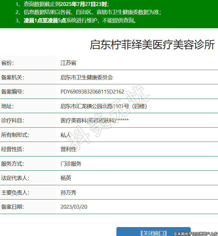 省份:江蘇省備案機關(guān):啟東市衛(wèi)生健康委員會備案編號:PDY69093832068115D2162地址:啟東市匯龍鎮(zhèn)公園北路1101號(四樓)診療科目:醫(yī)療美容科(美容皮膚科)******所有制形式:私人經(jīng)營性質(zhì):營利性服務(wù)方式:門診服務(wù)法定代表人:楊英主要負責(zé)人:孫萬秀備案日期:2023/03/20 -