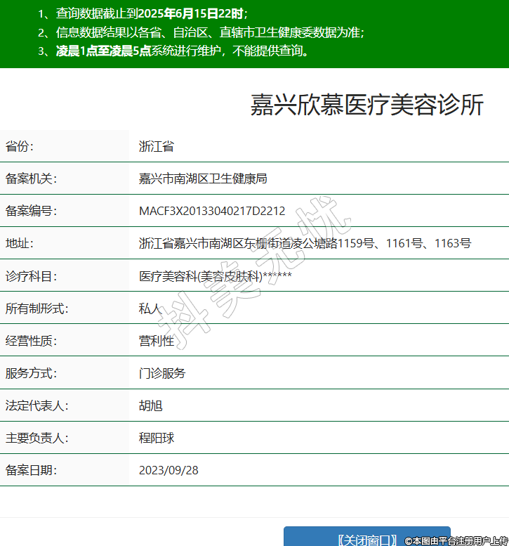 省份:浙江省備案機(jī)關(guān):嘉興市南湖區(qū)衛(wèi)生健康局備案編號(hào):MACF3X20133040217D2212地址:浙江省嘉興市南湖區(qū)東柵街道凌公塘路1159號(hào)、1161號(hào)、1163號(hào)診療科目:醫(yī)療美容科(美容皮膚科)******所有制形式:私人經(jīng)營(yíng)性質(zhì):營(yíng)利性服務(wù)方式:門診服務(wù)法定代表人:胡旭主要負(fù)責(zé)人:程陽(yáng)球備案日期:2023/09/28 -