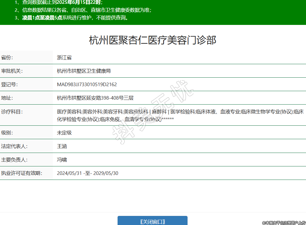 省份:浙江省審批機關(guān):杭州市拱墅區(qū)衛(wèi)生健康局登記號:MAD983JJ733010519D2162地址:杭州市拱墅區(qū)延安路398-408號三層診療科目:醫(yī)療美容科;美容外科;美容牙科;美容皮膚科 | 麻醉科 | 醫(yī)學檢驗科;臨床體液、血液專業(yè);臨床微生物學專業(yè)(協(xié)議);臨床化學檢驗專業(yè)(協(xié)議);臨床免疫、血清學專業(yè)(協(xié)議)******級別:未定級法定代表人:王涵主要負責人:馮嘯執(zhí)業(yè)許可證有效期:2024/05/31 -至- 2029/05/30 -