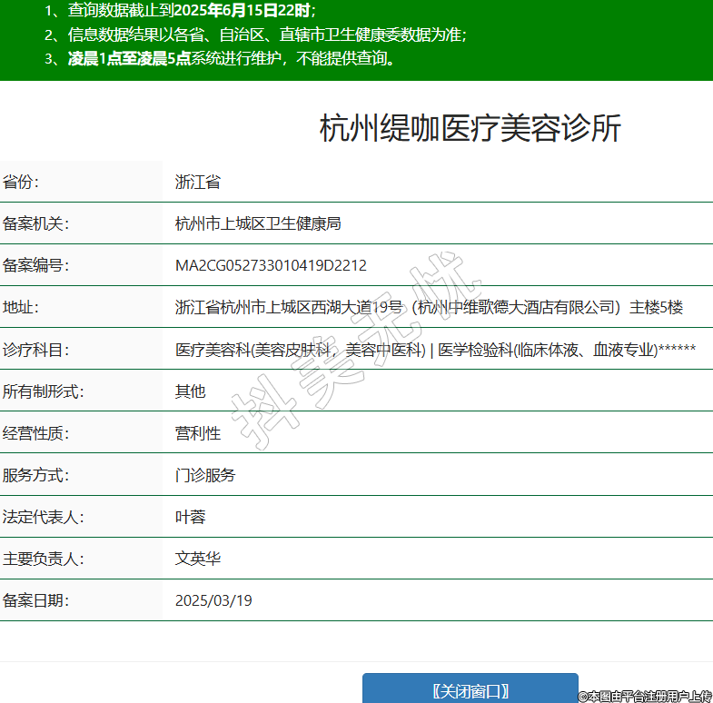 省份:浙江省備案機關(guān):杭州市上城區(qū)衛(wèi)生健康局備案編號:MA2CG052733010419D2212地址:浙江省杭州市上城區(qū)西湖大道19號(杭州中維歌德大酒店有限公司)主樓5樓診療科目:醫(yī)療美容科(美容皮膚科,美容中醫(yī)科) | 醫(yī)學檢驗科(臨床體液、血液專業(yè))******所有制形式:其他經(jīng)營性質(zhì):營利性服務方式:門診服務法定代表人:葉蓉主要負責人:文英華備案日期:2025/03/19 -