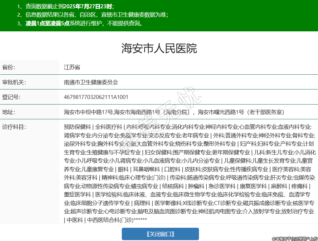 省份:江蘇省審批機關(guān):南通市衛(wèi)生健康委員會登記號:46798177032062111A1001地址:海安市中壩中路17號,海安市海南西路1號(海南分院),海安市曙光西路1號(老干部醫(yī)務(wù)室)診療科目:預(yù)防保健科 | 全科醫(yī)療科 | 內(nèi)科;呼吸內(nèi)科專業(yè);消化內(nèi)科專業(yè);神經(jīng)內(nèi)科專業(yè);心血管內(nèi)科專業(yè);血液內(nèi)科專業(yè);腎病學(xué)專業(yè);內(nèi)分泌專業(yè);免疫學(xué)專業(yè);變態(tài)反應(yīng)專業(yè);老年病專業(yè) | 外科;普通外科專業(yè);神經(jīng)外科專業(yè);骨科專業(yè);泌尿外科專業(yè);胸外科專業(yè);心臟大血管外科專業(yè);燒傷科專業(yè);整形外科專業(yè) | 婦產(chǎn)科;婦科專業(yè);產(chǎn)科專業(yè);計劃生育專業(yè);生殖健康與不孕癥專業(yè) | 婦女保健科;圍產(chǎn)期保健專業(yè);更年期保健專業(yè) | 兒科;新生兒專業(yè);小兒消化專業(yè);小兒呼吸專業(yè);小兒腎病專業(yè);小兒血液病專業(yè);小兒內(nèi)分泌專業(yè) | 兒童保健科;兒童生長發(fā)育專業(yè);兒童營養(yǎng)專業(yè);兒童康復(fù)專業(yè) | 眼科 | 耳鼻咽喉科 | 口腔科 | 皮膚科;皮膚病專業(yè);性傳播疾病專業(yè) | 醫(yī)療美容科;美容外科;美容牙科 | 精神科;臨床心理專業(yè)(門診) | 傳染科;腸道傳染病專業(yè);呼吸道傳染病專業(yè);肝炎專業(yè);蟲媒傳染病專業(yè);動物源性傳染病專業(yè);蠕蟲病專業(yè) | 結(jié)核病科 | 腫瘤科 | 急診醫(yī)學(xué)科 | 康復(fù)醫(yī)學(xué)科 | 麻醉科 | 疼痛科 | 重癥醫(yī)學(xué)科 | 醫(yī)學(xué)檢驗科;臨床體液、血液專業(yè);臨床微生物學(xué)專業(yè);臨床化學(xué)檢驗專業(yè);臨床免疫、血清學(xué)專業(yè);臨床細胞分子遺傳學(xué)專業(yè) | 病理科 | 醫(yī)學(xué)影像科;X線診斷專業(yè);CT診斷專業(yè);磁共振成像診斷專業(yè);核醫(yī)學(xué)專業(yè);超聲診斷專業(yè);心電診斷專業(yè);腦電及腦血流圖診斷專業(yè);神經(jīng)肌肉電圖專業(yè);介入放射學(xué)專業(yè);放射治療專業(yè) | 中醫(yī)科 | 中西醫(yī)結(jié)合科(門診)******級別:三級法定代表人:吉華亮主要負責(zé)人:呂書軍執(zhí)業(yè)許可證有效期:2022/08/22 -至- 2036/03/19 -