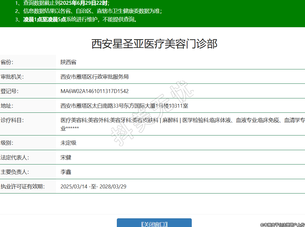 省份:陜西省審批機(jī)關(guān):西安市雁塔區(qū)行政審批服務(wù)局登記號(hào):MA6W02A1461011317D1542地址:西安市雁塔區(qū)太白南路33號(hào)東方國(guó)際大廈1號(hào)樓10311室診療科目:醫(yī)療美容科;美容外科;美容牙科;美容皮膚科 | 麻醉科 | 醫(yī)學(xué)檢驗(yàn)科;臨床體液、血液專業(yè);臨床免疫、血清學(xué)專業(yè)******級(jí)別:未定級(jí)法定代表人:宋健主要負(fù)責(zé)人:李鑫執(zhí)業(yè)許可證有效期:2025/03/14 -至- 2028/03/29 -