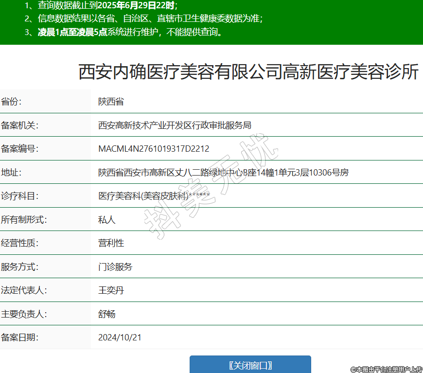 省份:陜西省備案機(jī)關(guān):西安高新技術(shù)產(chǎn)業(yè)開(kāi)發(fā)區(qū)行政審批服務(wù)局備案編號(hào):MACML4N2761019317D2212地址:陜西省西安市高新區(qū)丈八二路綠地中心B座14幢1單元3層10306號(hào)房診療科目:醫(yī)療美容科(美容皮膚科)******所有制形式:私人經(jīng)營(yíng)性質(zhì):營(yíng)利性服務(wù)方式:門診服務(wù)法定代表人:王奕丹主要負(fù)責(zé)人:舒暢備案日期:2024/10/21 -