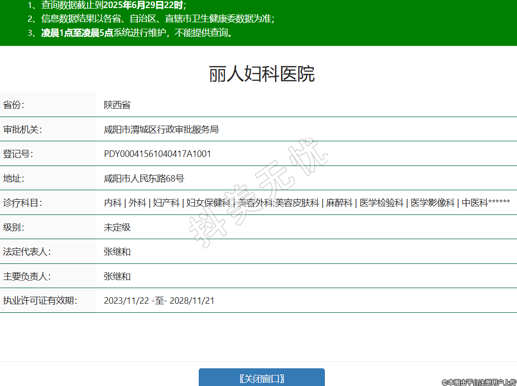 省份:陜西省審批機關(guān):咸陽市渭城區(qū)行政審批服務(wù)局登記號:PDY00041561040417A1001地址:咸陽市人民東路68號診療科目:內(nèi)科 | 外科 | 婦產(chǎn)科 | 婦女保健科 | 美容外科;美容皮膚科 | 麻醉科 | 醫(yī)學檢驗科 | 醫(yī)學影像科 | 中醫(yī)科******級別:未定級法定代表人:張繼和主要負責人:張繼和執(zhí)業(yè)許可證有效期:2023/11/22 -至- 2028/11/21 -