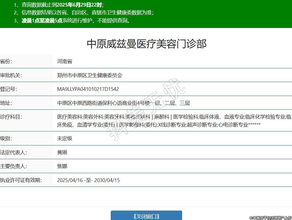 鄭州威茲曼醫(yī)療美容,診療科目:醫(yī)療美容科;美容外科;美容牙科;美容皮膚科 | 麻醉科 | 醫(yī)學(xué)檢驗(yàn)科;臨床體液、血液專業(yè);臨床化學(xué)檢驗(yàn)專業(yè);臨床免疫、血清學(xué)專業(yè)(委托) | 醫(yī)學(xué)影像科(委托);X線診斷專業(yè);超聲診斷專業(yè);心電診斷專業(yè)******