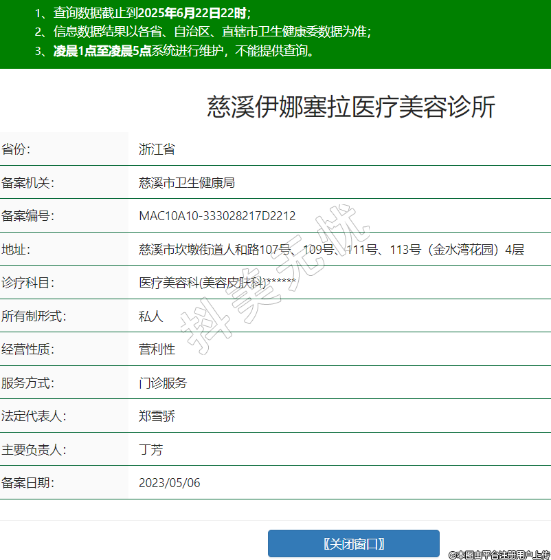 省份:浙江省備案機(jī)關(guān):慈溪市衛(wèi)生健康局備案編號(hào):MAC10A10-333028217D2212地址:慈溪市坎墩街道人和路107號(hào)、109號(hào)、111號(hào)、113號(hào)(金水灣花園)4層診療科目:醫(yī)療美容科(美容皮膚科)******所有制形式:私人經(jīng)營(yíng)性質(zhì):營(yíng)利性服務(wù)方式:門(mén)診服務(wù)法定代表人:鄭雪驕主要負(fù)責(zé)人:丁芳備案日期:2023/05/06 -