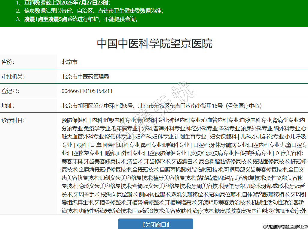 省份:北京市審批機關(guān):北京市中醫(yī)藥管理局登記號:004666110105154211地址:北京市朝陽區(qū)望京中環(huán)南路6號、北京市東城區(qū)東直門內(nèi)南小街甲16號(骨傷醫(yī)療中心)診療科目:預(yù)防保健科 | 內(nèi)科;呼吸內(nèi)科專業(yè);消化內(nèi)科專業(yè);神經(jīng)內(nèi)科專業(yè);心血管內(nèi)科專業(yè);血液內(nèi)科專業(yè);腎病學(xué)專業(yè);內(nèi)分泌專業(yè);免疫學(xué)專業(yè);老年病專業(yè) | 外科;普通外科專業(yè);神經(jīng)外科專業(yè);骨科專業(yè);泌尿外科專業(yè);胸外科專業(yè);心臟大血管外科專業(yè);燒傷科專業(yè) | 婦產(chǎn)科;婦科專業(yè);計劃生育專業(yè) | 婦女保健科 | 兒科;小兒消化專業(yè);小兒呼吸專業(yè) | 眼科 | 耳鼻咽喉科;耳科專業(yè);鼻科專業(yè);咽喉科專業(yè) | 口腔科;牙體牙髓病專業(yè);口腔內(nèi)科專業(yè);兒童口腔專業(yè);口腔修復(fù)專業(yè);口腔頜面外科專業(yè);口腔預(yù)防保健專業(yè) | 皮膚科;皮膚病專業(yè);性傳播疾病專業(yè) | 醫(yī)療美容科;美容牙科;牙齒美容修復(fù)技術(shù);潔齒術(shù);牙齒修形術(shù);牙齒漂白術(shù);復(fù)合樹脂黏結(jié)修復(fù)技術(shù);瓷貼面修復(fù)技術(shù);樁冠修復(fù)技術(shù);金屬烤瓷冠橋修復(fù)技術(shù);全瓷冠技術(shù);自凝丙稀酸樹脂臨時冠技術(shù);可摘局部義齒美容修復(fù)技術(shù);全口義齒美容修復(fù)技術(shù);即刻義齒美容修復(fù)技術(shù);植牙美容修復(fù)技術(shù);黏結(jié)鑄造固定橋美容修復(fù)技術(shù);柔性義齦美容修復(fù)技術(shù);隱形義齒美容修復(fù)技術(shù);套筒冠義齒美容修復(fù)技術(shù);牙周美容技術(shù)操作;牙齦切除術(shù);牙齦成形術(shù);牙冠延長術(shù);牙周骨手術(shù);根尖向復(fù)位瓣術(shù);側(cè)向轉(zhuǎn)位瓣術(shù);雙乳頭瓣移位術(shù);冠向復(fù)位瓣術(shù);自體游離齦瓣移植術(shù);牙周引導(dǎo)組織再生術(shù);牙槽骨修整術(shù);牙槽骨嵴修整術(shù);牙槽嵴增高術(shù);牙頜畸形美容矯治技術(shù);機械性活動性矯治器矯治技術(shù);功能性矯治器矯治技術(shù);固定矯治技術(shù);美容皮膚科;治療技術(shù);糖皮質(zhì)激素皮損內(nèi)注射;藥物加壓治療;外用藥物治療;光化學(xué)療法;美容皮膚術(shù)(內(nèi)科);皮膚磨削術(shù);酒渣鼻切割術(shù);皮膚腫物切除術(shù);拔甲術(shù);刮除術(shù);自體表皮移植術(shù);腋臭手術(shù);足病修治術(shù);毛發(fā)移植術(shù);美容中醫(yī)科;針灸美容;針刺術(shù);毫針術(shù);三棱針術(shù);皮膚針(梅花針)術(shù);皮內(nèi)針術(shù);火針術(shù);電針術(shù);水針(穴位注射)術(shù);炙術(shù);耳針術(shù);拔罐術(shù);中醫(yī)推拿美容;中藥外治;其他中醫(yī)美容技術(shù);穴位埋線療法;結(jié)扎法;美容醫(yī)療應(yīng)用技術(shù);物理美容治療術(shù);激光美容治療術(shù);高頻電美容治療;冷凍美容治療;其他物理美容治療;脫毛術(shù);穿耳孔術(shù) | 傳染科;腸道傳染病專業(yè) | 急診醫(yī)學(xué)科 | 康復(fù)醫(yī)學(xué)科 | 運動醫(yī)學(xué)科 | 麻醉科 | 疼痛科 | 醫(yī)學(xué)檢驗科;臨床體液、血液專業(yè);臨床微生物學(xué)專業(yè);臨床化學(xué)檢驗專業(yè);臨床免疫、血清學(xué)專業(yè);臨床細(xì)胞分子遺傳學(xué)專業(yè) | 病理科 | 醫(yī)學(xué)影像科;X線診斷專業(yè);CT診斷專業(yè);磁共振成像診斷專業(yè);超聲診斷專業(yè);心電診斷專業(yè);腦電及腦血流圖診斷專業(yè);神經(jīng)肌肉電圖專業(yè);介入放射學(xué)專業(yè);放射治療專業(yè) | 中醫(yī)科;內(nèi)科專業(yè)(含風(fēng)濕免疫科 男科門診 抑郁癥門診);外科專業(yè);婦產(chǎn)科專業(yè);兒科專業(yè);皮膚科專業(yè);眼科專業(yè);耳鼻咽喉科專業(yè);口腔科專業(yè);腫瘤科專業(yè);骨傷科專業(yè);肛腸科專業(yè);老年病科專業(yè);針灸科專業(yè);推拿科專業(yè);康復(fù)醫(yī)學(xué)專業(yè);急診科專業(yè);預(yù)防保健科專業(yè) | 中西醫(yī)結(jié)合科******級別:三級法定代表人:高景華主要負(fù)責(zé)人:高景華執(zhí)業(yè)許可證有效期:2023/05/06 -至- 2025/12/31 -
