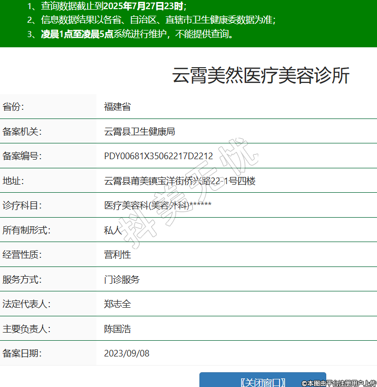 省份:福建省備案機關(guān):云霄縣衛(wèi)生健康局備案編號:PDY00681X35062217D2212地址:云霄縣莆美鎮(zhèn)寶洋街僑興路22-1號四樓診療科目:醫(yī)療美容科(美容外科)******所有制形式:私人經(jīng)營性質(zhì):營利性服務(wù)方式:門診服務(wù)法定代表人:鄭志全主要負責人:陳國浩備案日期:2023/09/08 -