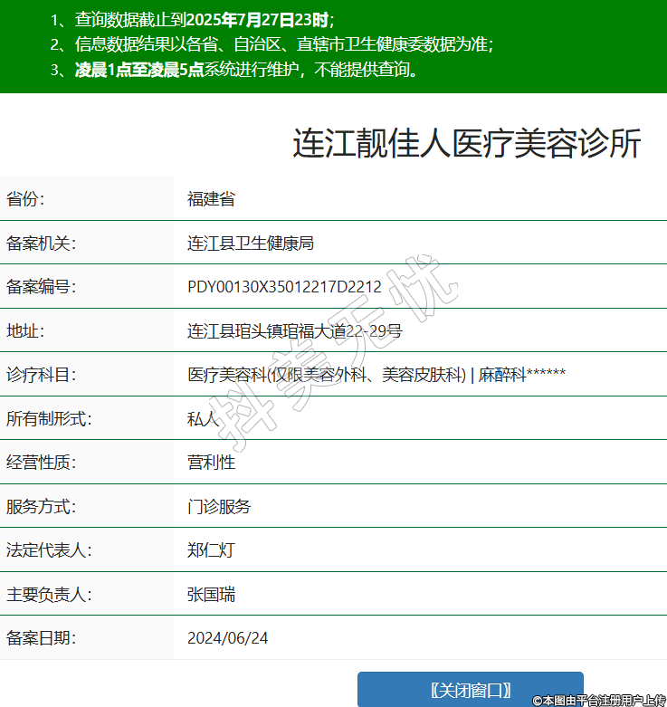 省份:福建省備案機(jī)關(guān):連江縣衛(wèi)生健康局備案編號(hào):PDY00130X35012217D2212地址:連江縣琯頭鎮(zhèn)琯福大道22-29號(hào)診療科目:醫(yī)療美容科(僅限美容外科、美容皮膚科) | 麻醉科******所有制形式:私人經(jīng)營性質(zhì):營利性服務(wù)方式:門診服務(wù)法定代表人:鄭仁燈主要負(fù)責(zé)人:張國瑞備案日期:2024/06/24 -