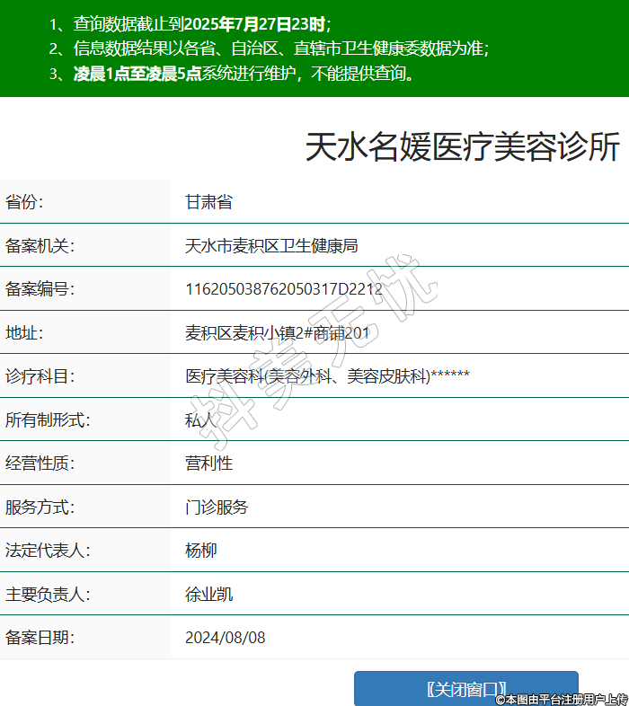 省份:甘肅省備案機(jī)關(guān):天水市麥積區(qū)衛(wèi)生健康局備案編號(hào):116205038762050317D2212地址:麥積區(qū)麥積小鎮(zhèn)2#商鋪201診療科目:醫(yī)療美容科(美容外科、美容皮膚科)******所有制形式:私人經(jīng)營(yíng)性質(zhì):營(yíng)利性服務(wù)方式:門(mén)診服務(wù)法定代表人:楊柳主要負(fù)責(zé)人:徐業(yè)凱備案日期:2024/08/08 -