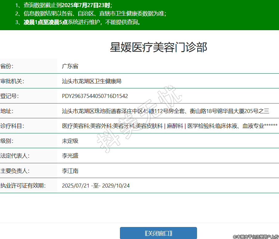 省份:廣東省審批機關(guān):汕頭市龍湖區(qū)衛(wèi)生健康局登記號:PDY29637544050716D1542地址:汕頭市龍湖區(qū)珠池街道春澤莊中區(qū)45幢112號房全套、衡山路18號錦華昌大廈205號之三診療科目:醫(yī)療美容科;美容外科;美容牙科;美容皮膚科 | 麻醉科 | 醫(yī)學(xué)檢驗科;臨床體液、血液專業(yè)******級別:未定級法定代表人:李光盛主要負責人:李江南執(zhí)業(yè)許可證有效期:2025/07/21 -至- 2029/10/24 -