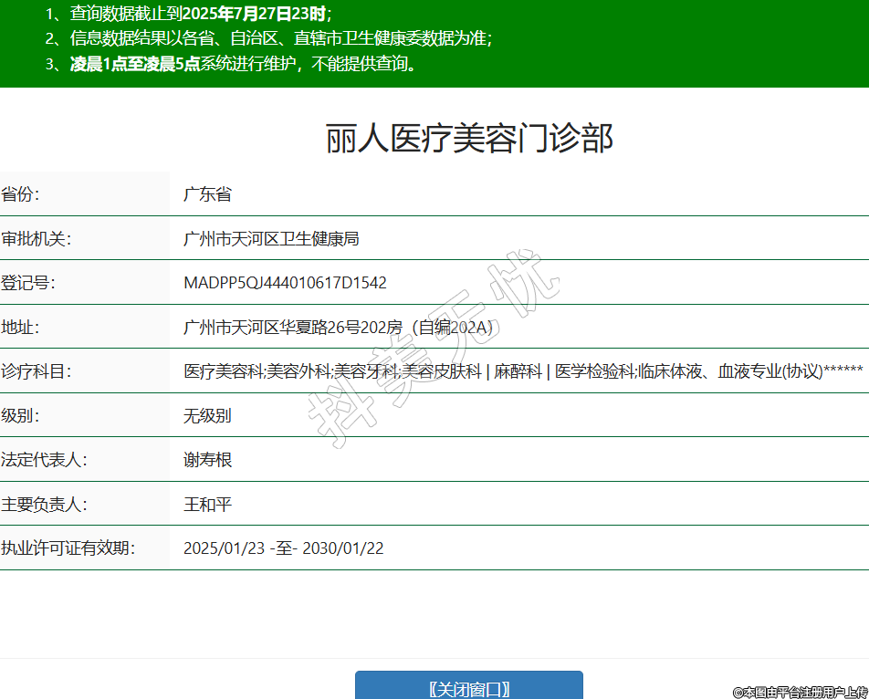 省份:廣東省審批機關:廣州市天河區(qū)衛(wèi)生健康局登記號:MADPP5QJ444010617D1542地址:廣州市天河區(qū)華夏路26號202房(自編202A)診療科目:醫(yī)療美容科;美容外科;美容牙科;美容皮膚科 | 麻醉科 | 醫(yī)學檢驗科;臨床體液、血液專業(yè)(協(xié)議)******級別:無級別法定代表人:謝壽根主要負責人:王和平執(zhí)業(yè)許可證有效期:2025/01/23 -至- 2030/01/22 -